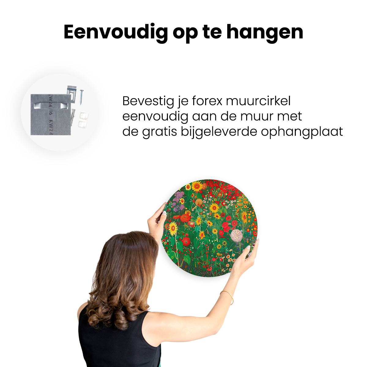 Gebruik het meegeleverde bevestigingsmateriaal om de wandcirkel aan de meeste wanden om te kunnen hangen. Een schroef en plug leveren we mee.