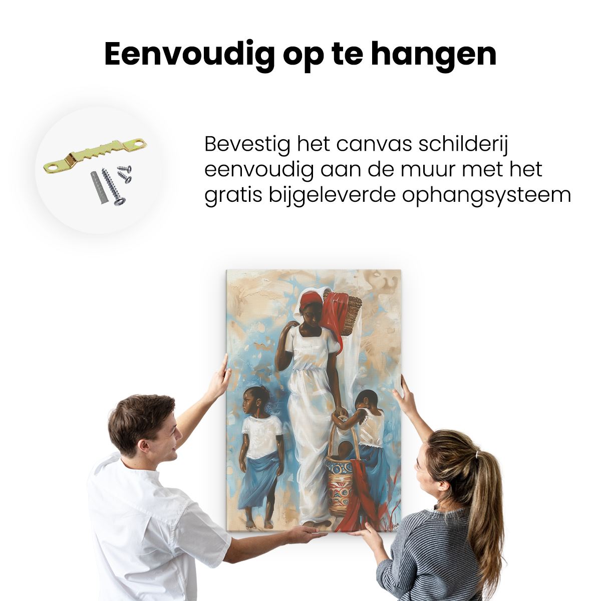 Bij aankoop ontvang je een meegeleverd ophangsysteem, zodat je op een simpele en snelle wijze het schilderij boven de bank of bed kan monteren.