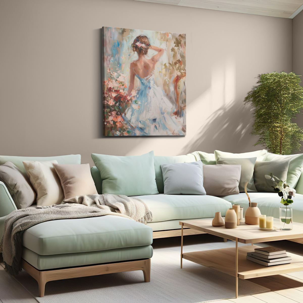 Schilderij Kunstwerk van een Vrouw in een Blauwe Jurk