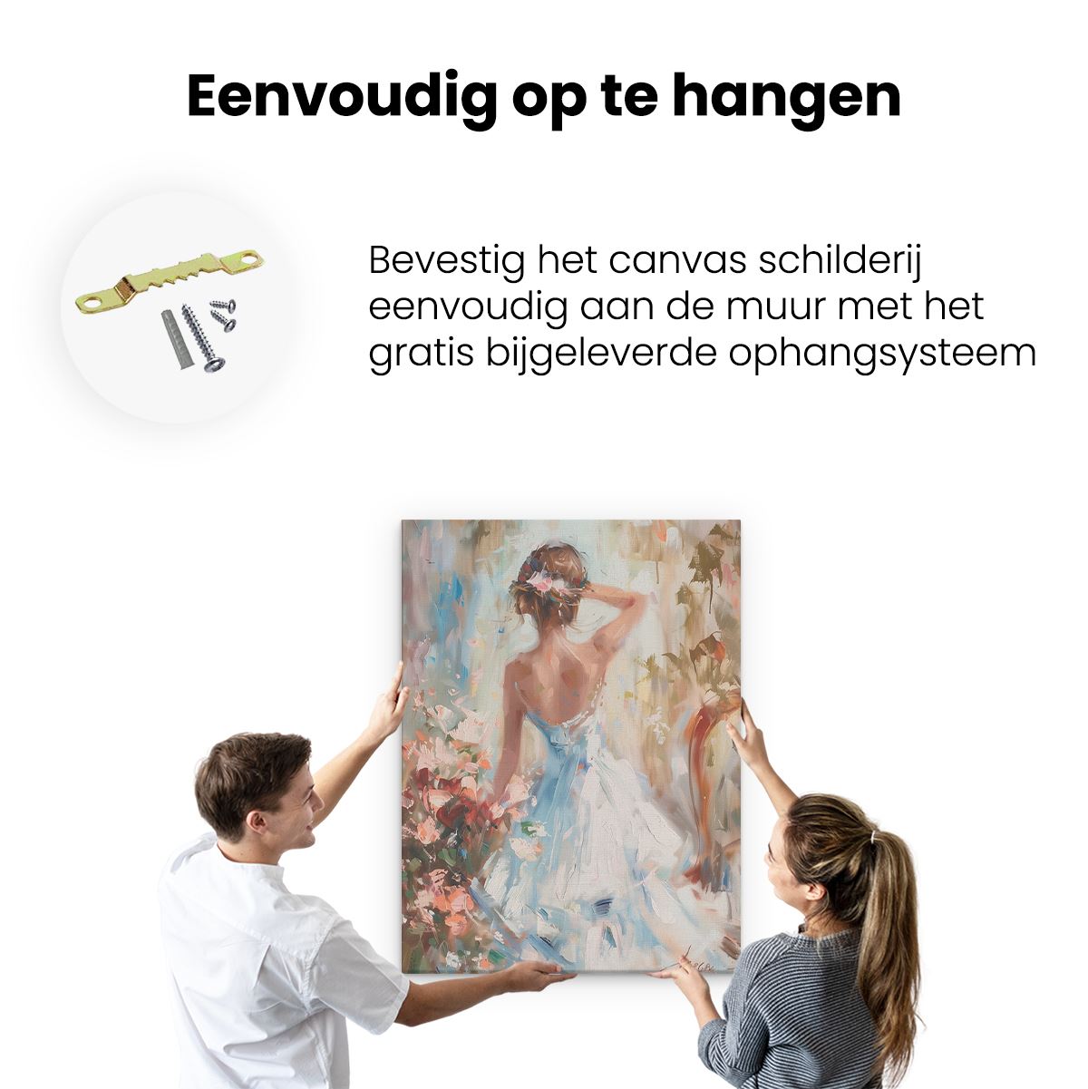 Bij aankoop ontvang je een meegeleverd ophangsysteem, zodat je op een simpele en snelle wijze het schilderij boven de bank of bed kan monteren.