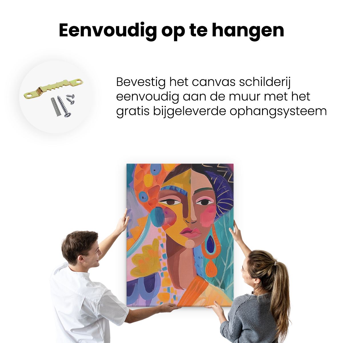 Bij aankoop ontvang je een meegeleverd ophangsysteem, zodat je op een simpele en snelle wijze het schilderij boven de bank of bed kan monteren.