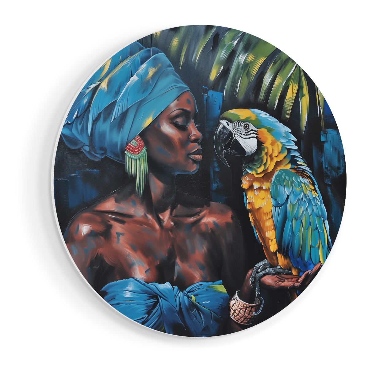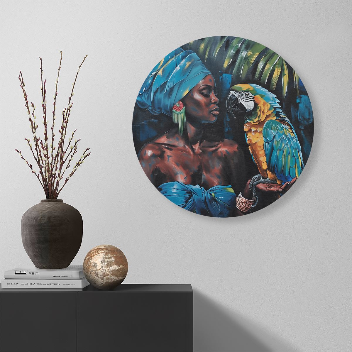 Wandcirkel Kunstwerk van een Vrouw met een Papegaai