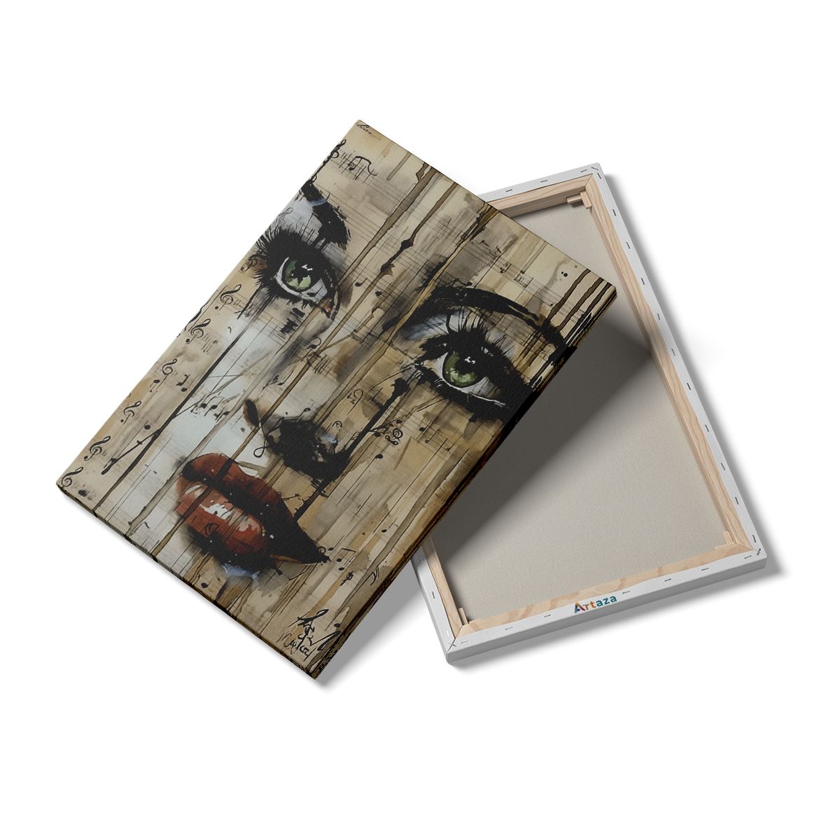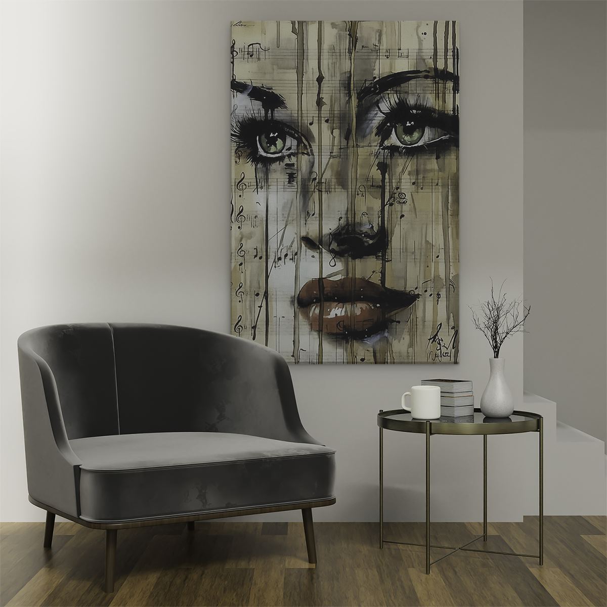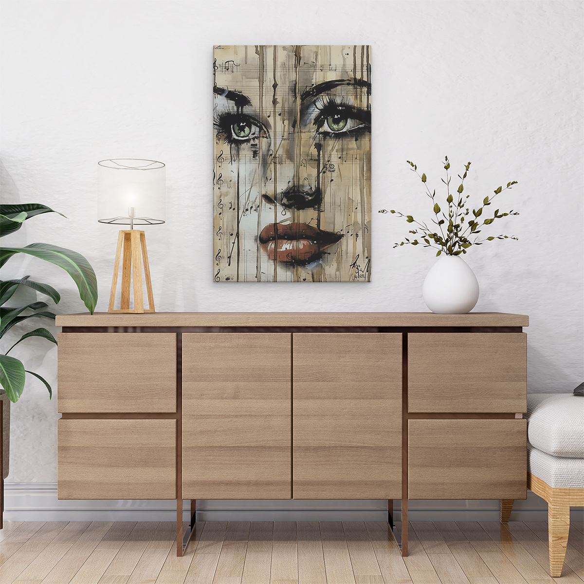 Schilderij Kunstwerk van een Vrouw met Muzieknoten op haar Gezicht