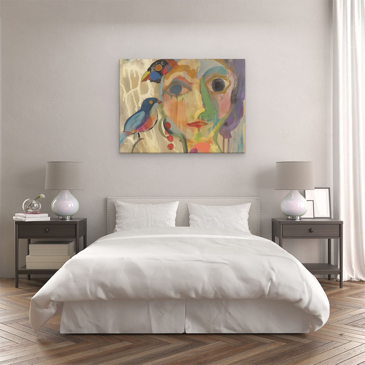 Schilderij Kunstwerk van een Vrouw met Vogels op haar Hoofd