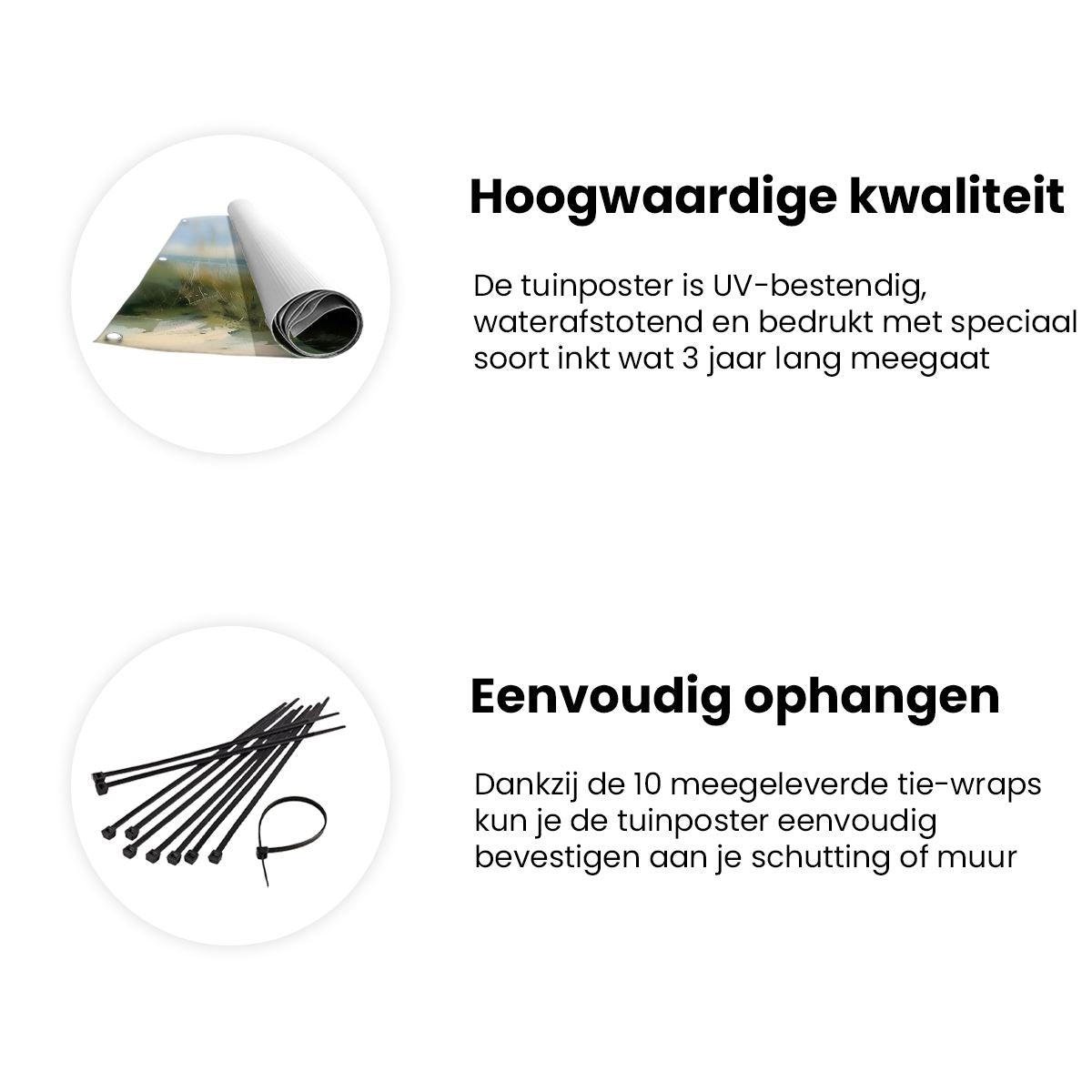 Bij aankoop ontvang je een meegeleverd ophangsysteem, zodat je op een simpele en snelle wijze de tuinposter kan ophangen.