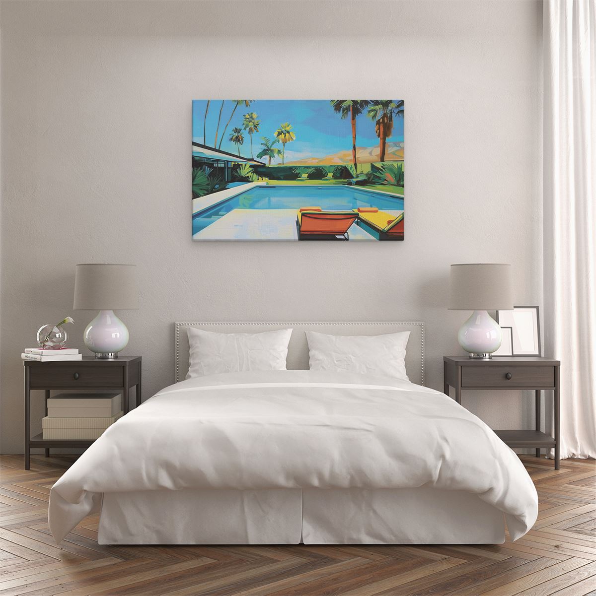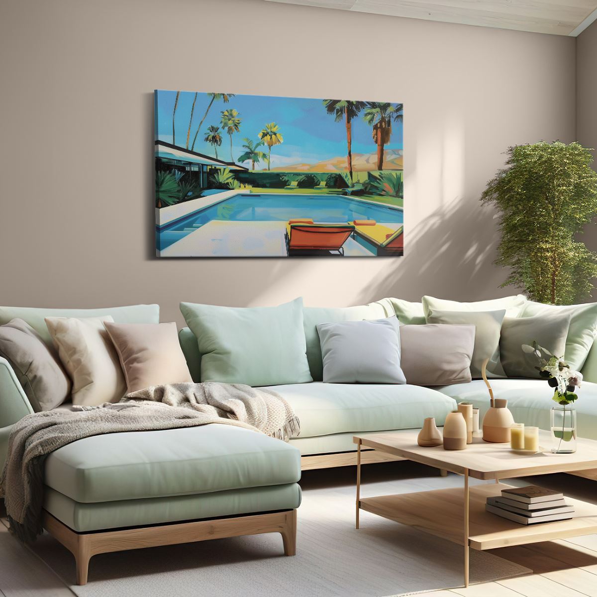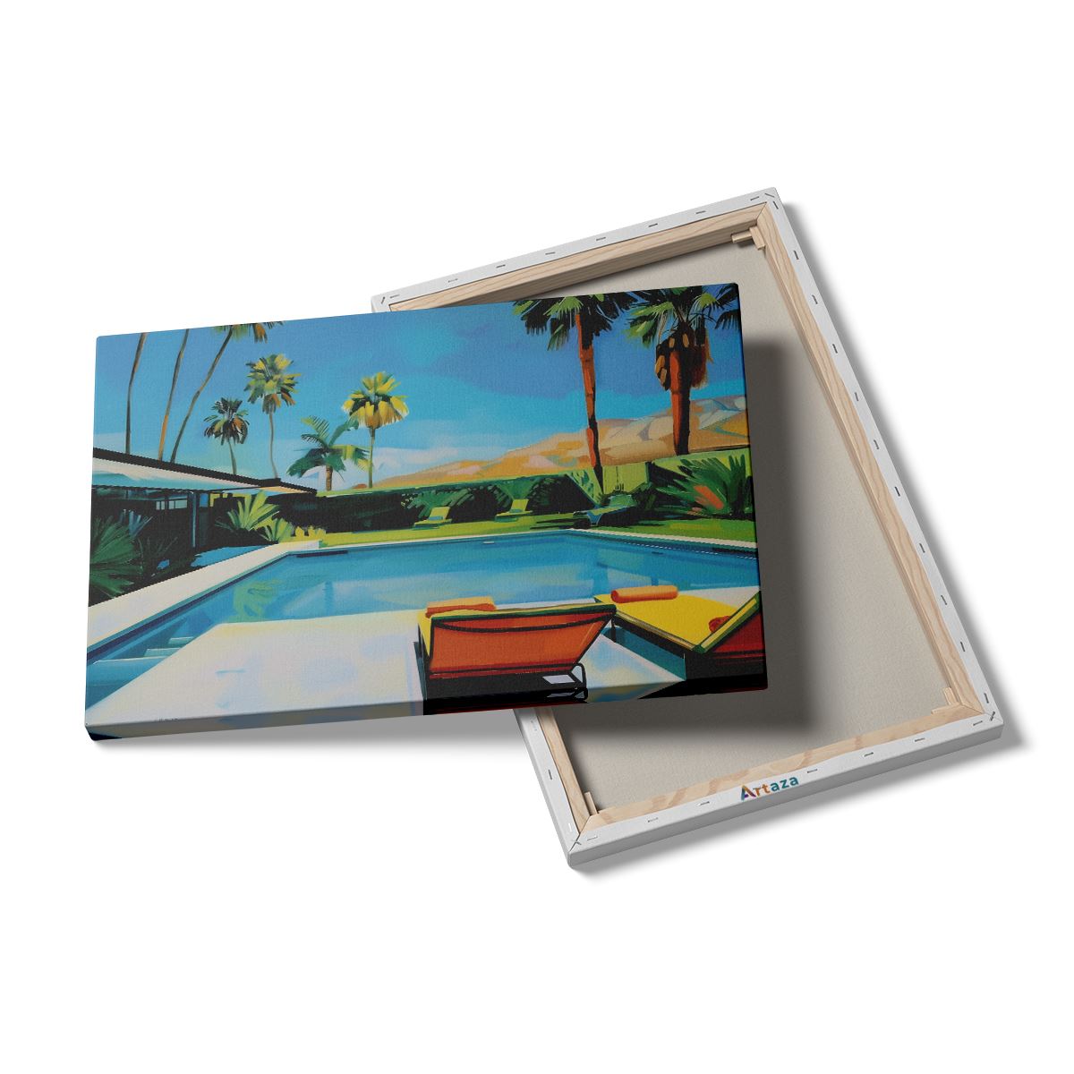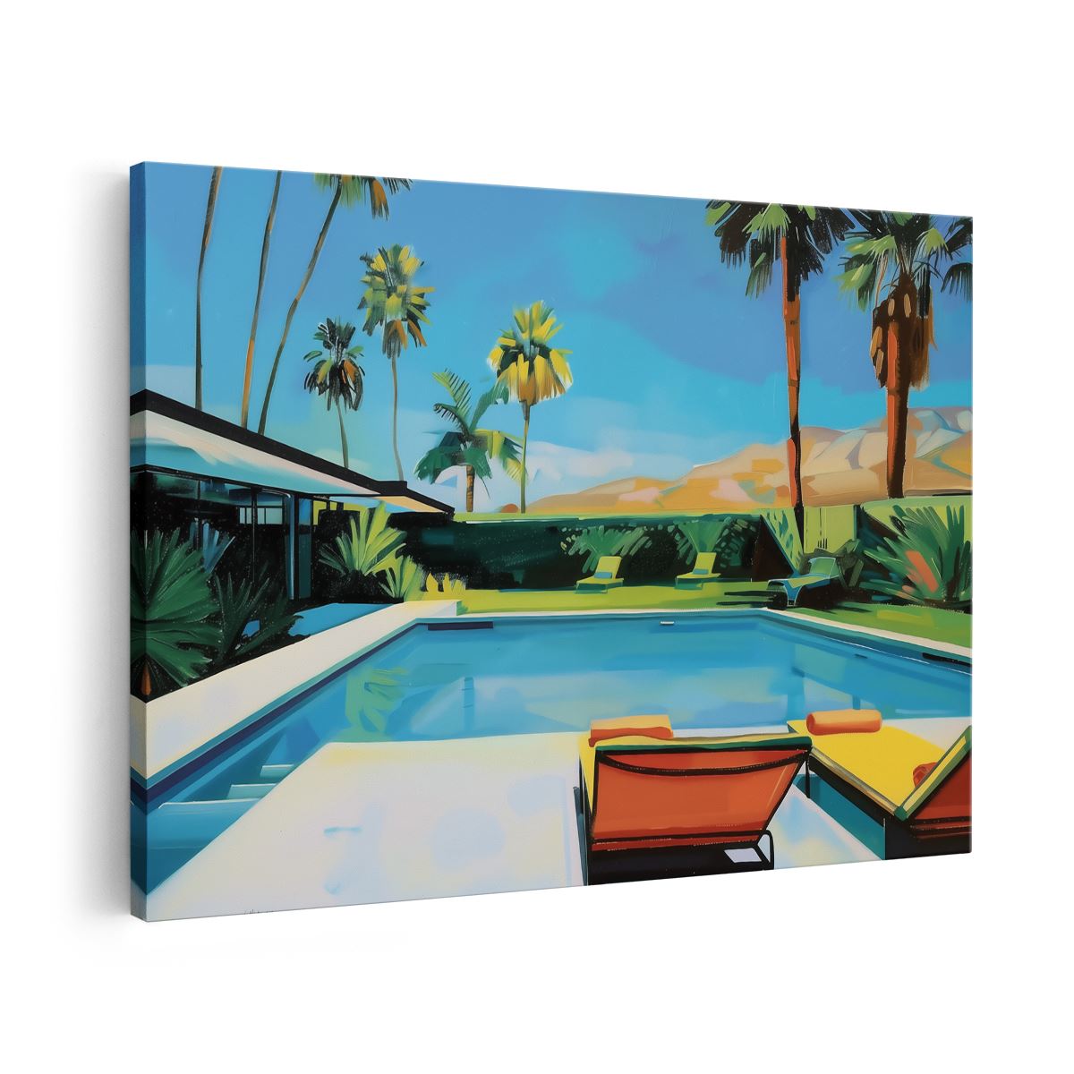 Schilderij Kunstwerk van een Zwembad met Ligstoelen en Palmbomen