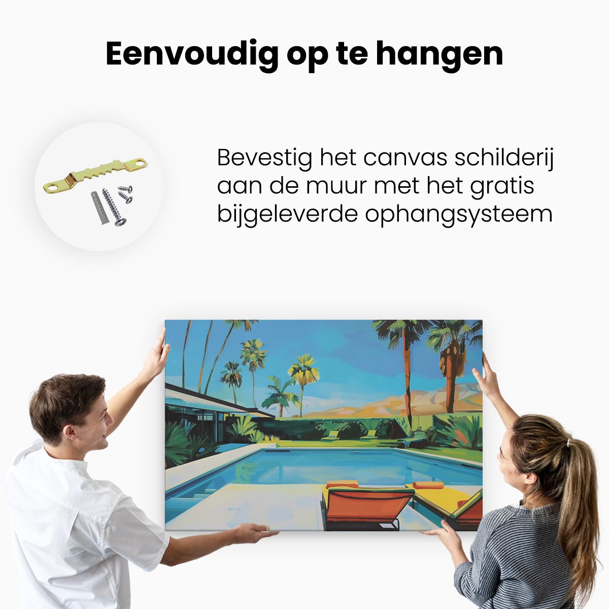 Bij aankoop ontvang je een meegeleverd ophangsysteem, zodat je op een simpele en snelle wijze het schilderij boven de bank of bed kan monteren.