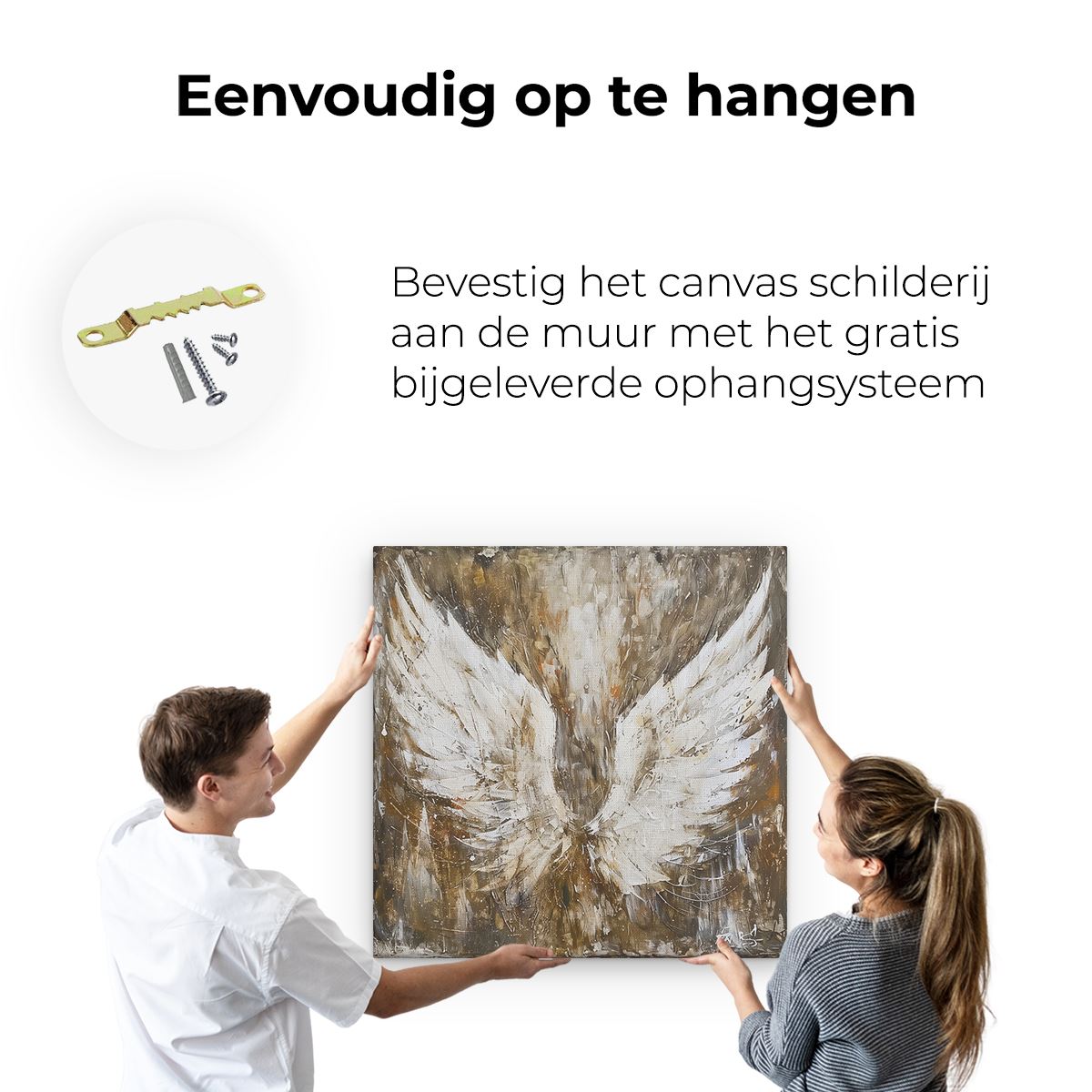 Bij aankoop ontvang je een meegeleverd ophangsysteem, zodat je op een simpele en snelle wijze het schilderij boven de bank of bed kan monteren.