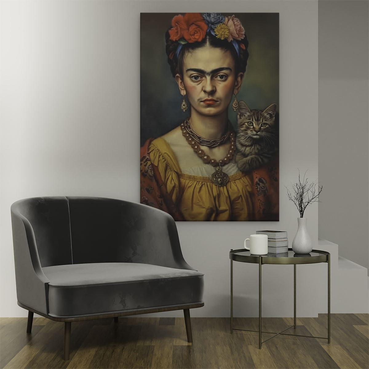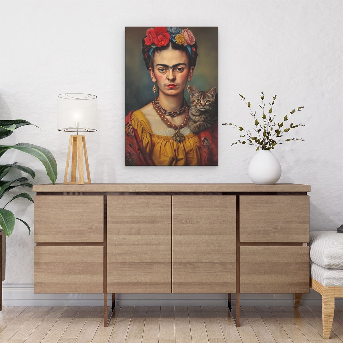 Schilderij Kunstwerk van Frida Kahlo met een Kat