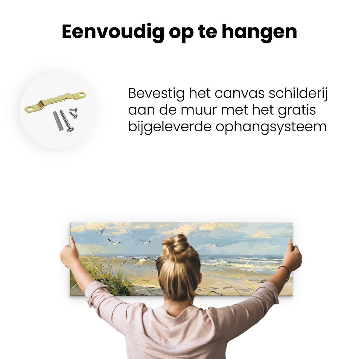 Bij aankoop ontvang je een meegeleverd ophangsysteem, zodat je op een simpele en snelle wijze het schilderij boven de bank of bed kan monteren.