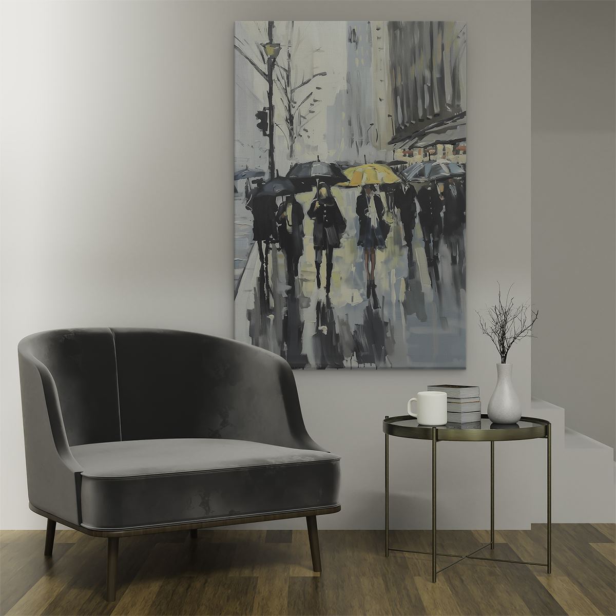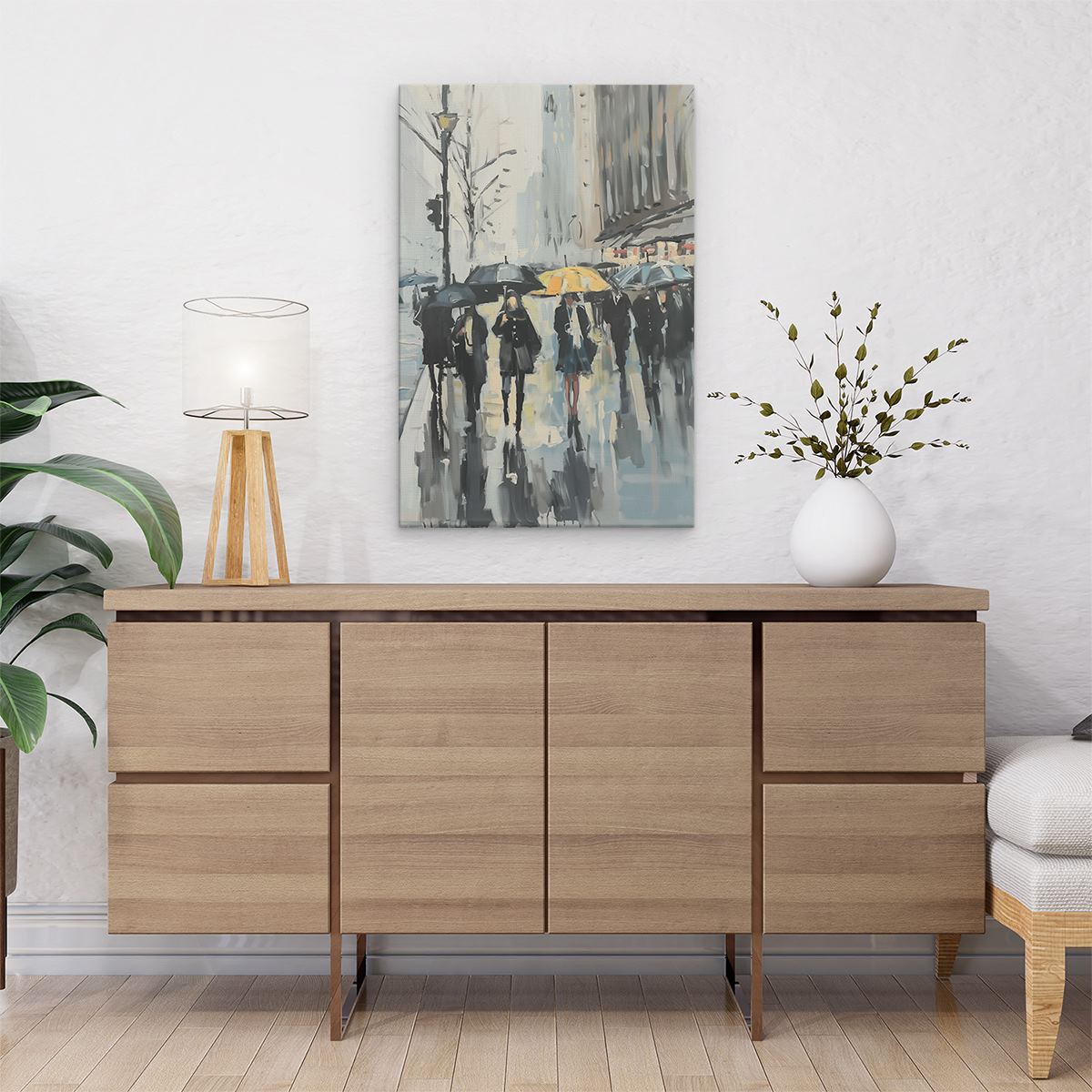 Schilderij Kunstwerk van Mensen die met Paraplu's in de Regen Lopen
