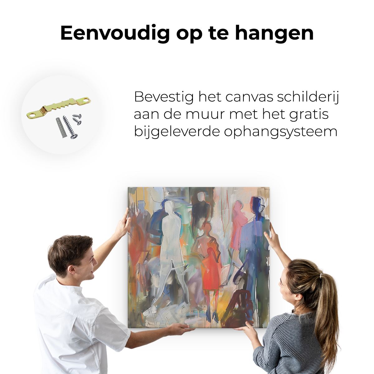 Bij aankoop ontvang je een meegeleverd ophangsysteem, zodat je op een simpele en snelle wijze het schilderij boven de bank of bed kan monteren.
