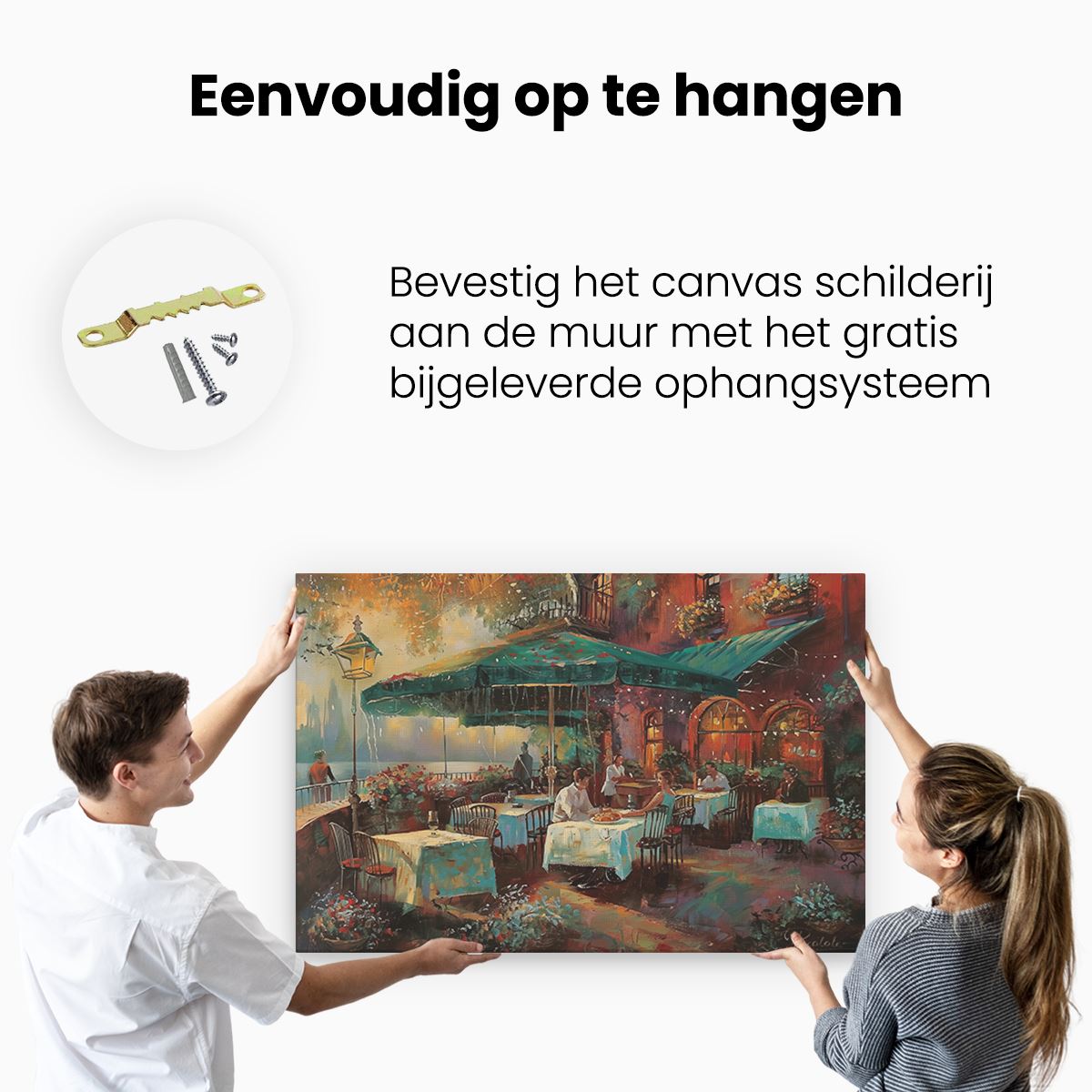 Bij aankoop ontvang je een meegeleverd ophangsysteem, zodat je op een simpele en snelle wijze het schilderij boven de bank of bed kan monteren.