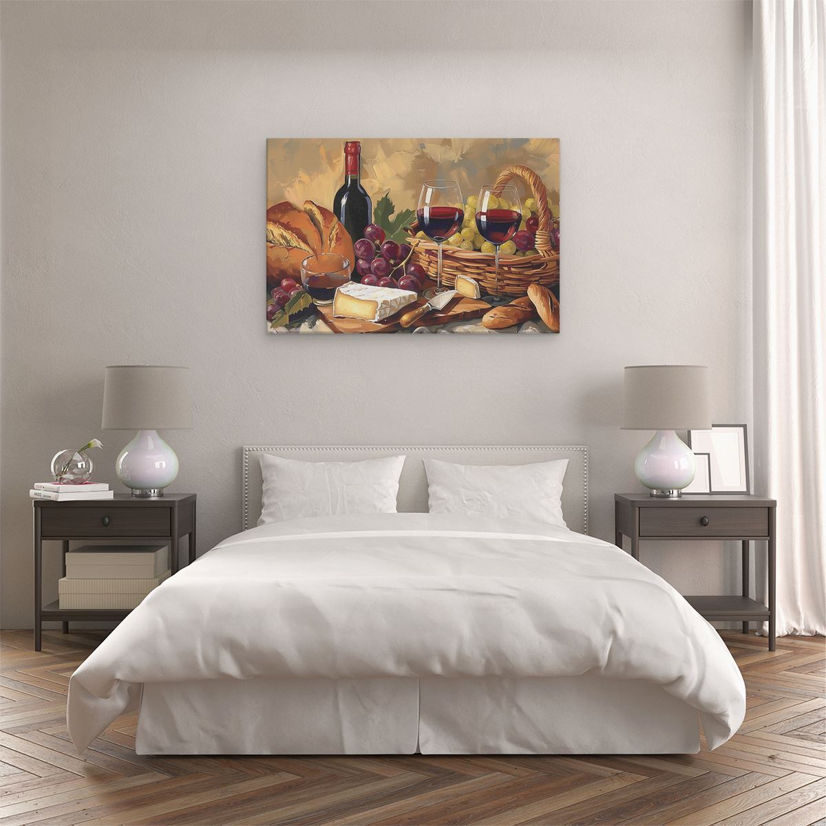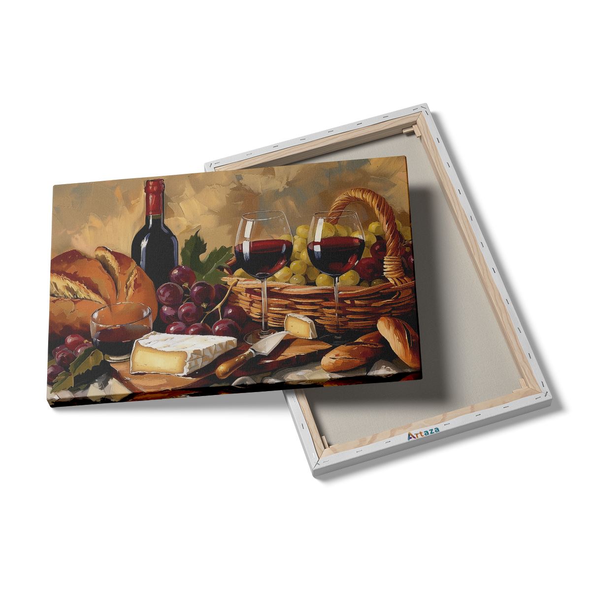 Schilderij Kunstwerk van Wijn, Brood en Kaas