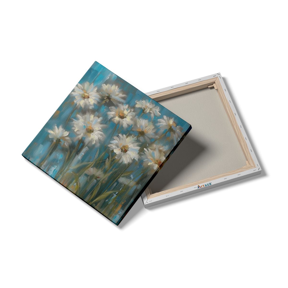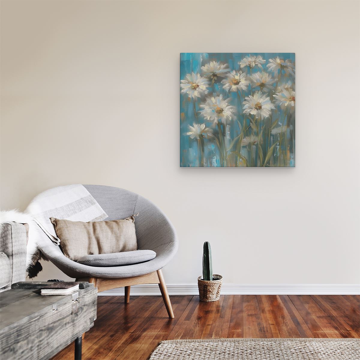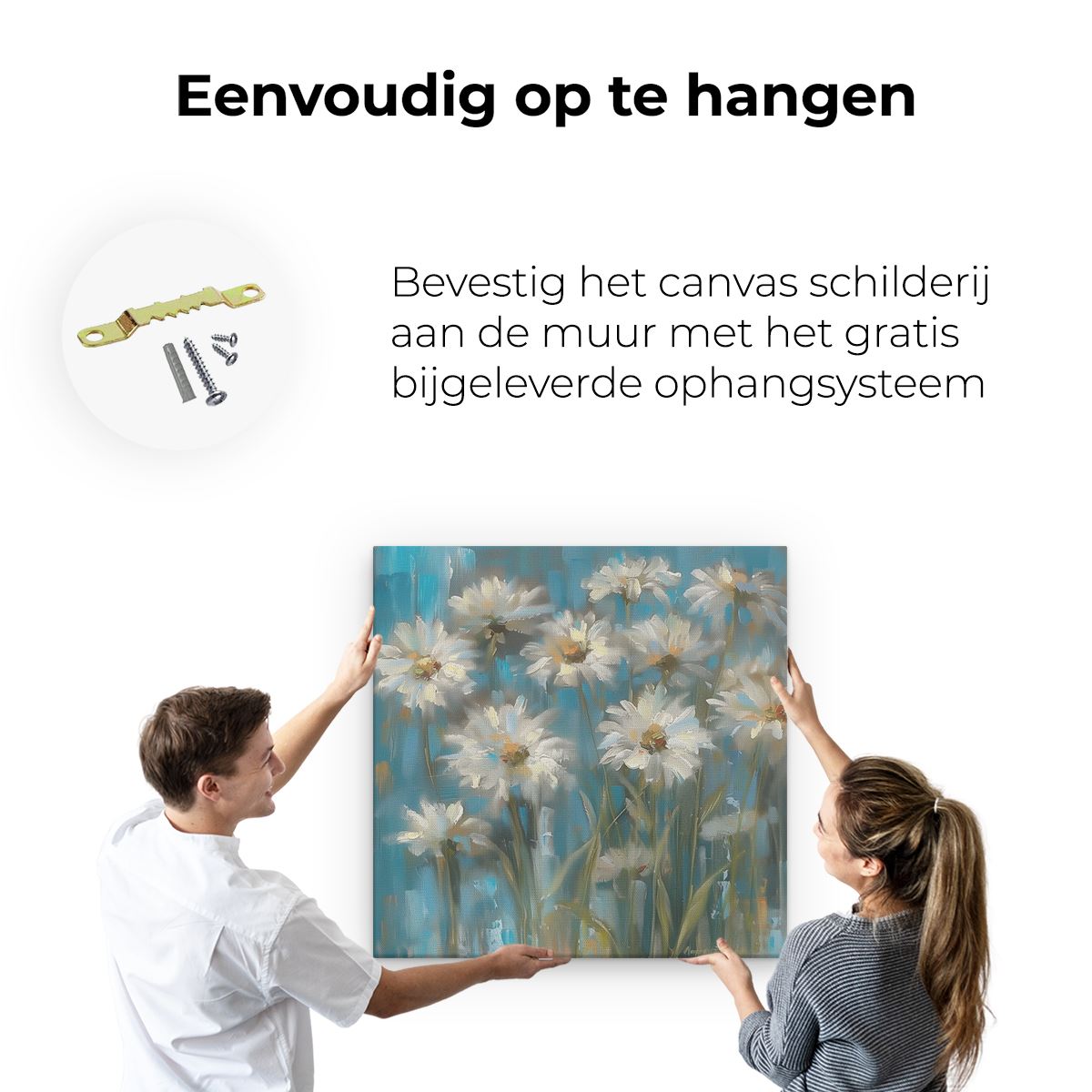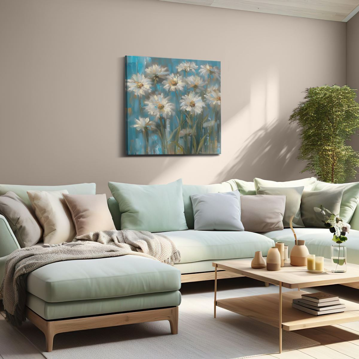 Schilderij Kunstwerk van Witte Madeliefjes op een Blauwe Achtergrond