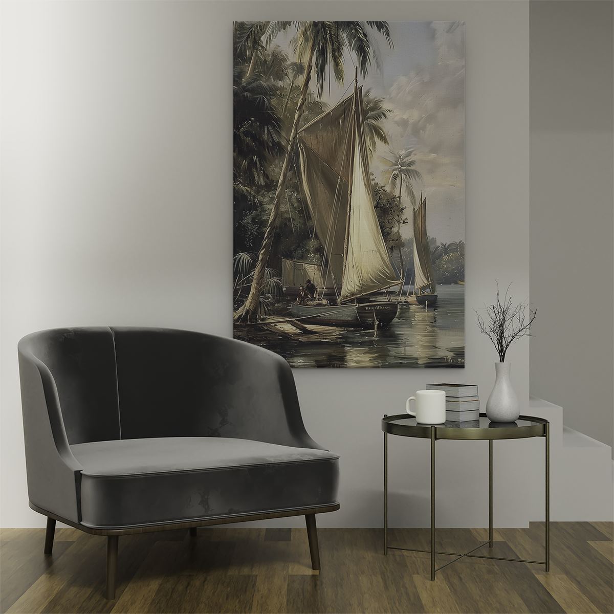 Schilderij Kunstwerk van Zeilboten op een Rivier met Palmbomen