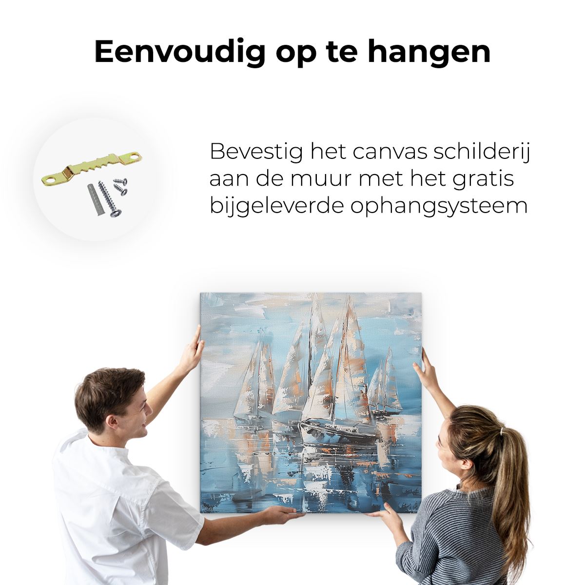 Bij aankoop ontvang je een meegeleverd ophangsysteem, zodat je op een simpele en snelle wijze het schilderij boven de bank of bed kan monteren.