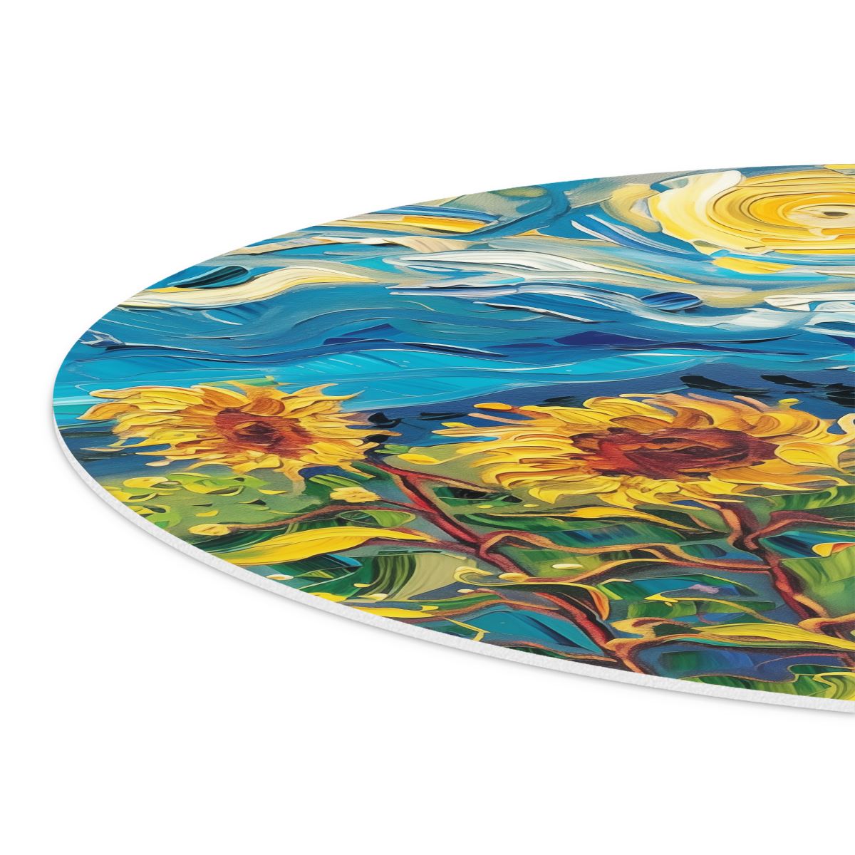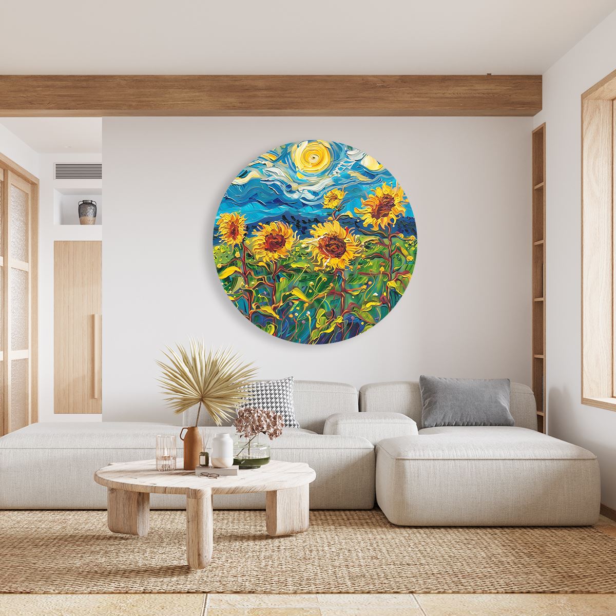 Wandcirkel Kunstwerk van Zonnebloemen in een Veld