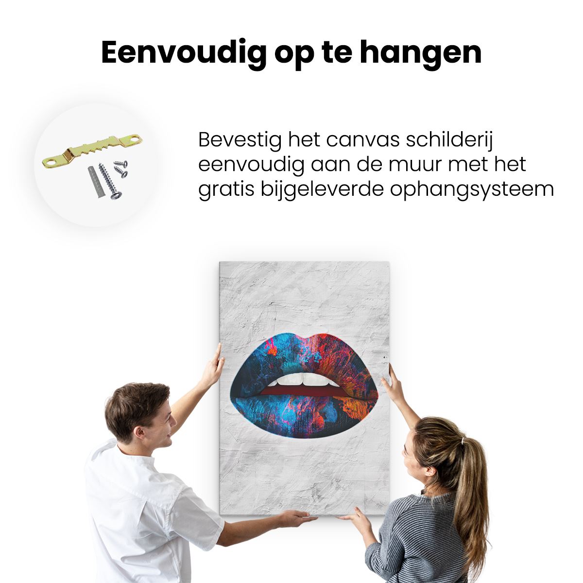 Bij aankoop ontvang je een meegeleverd ophangsysteem, zodat je op een simpele en snelle wijze het schilderij boven de bank of bed kan monteren.