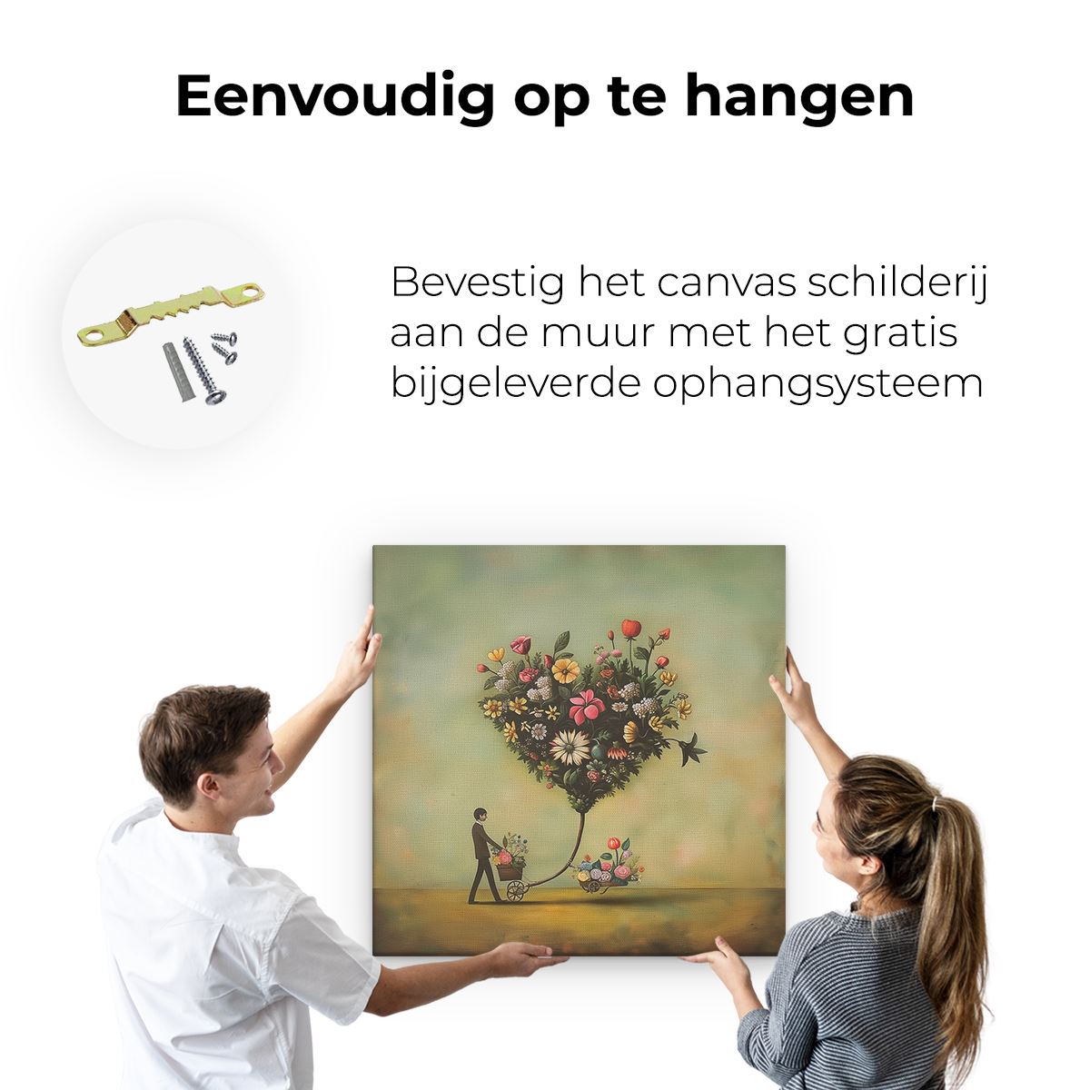 Schilderij Man die een Kar Voortduwt met een Hartvormig Boeket Bloemen