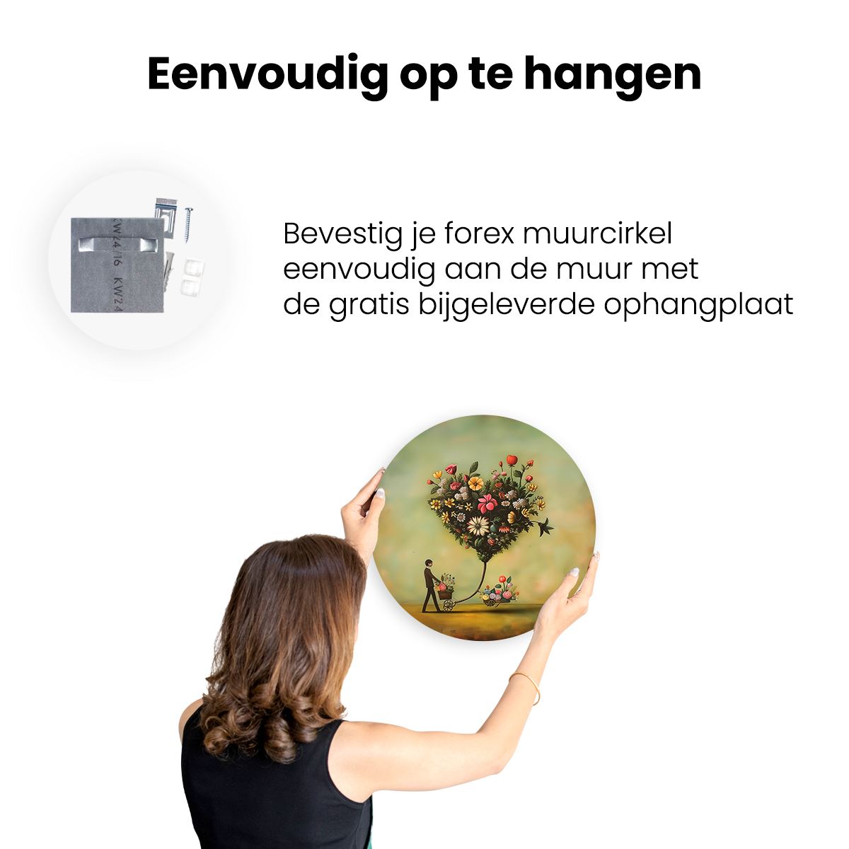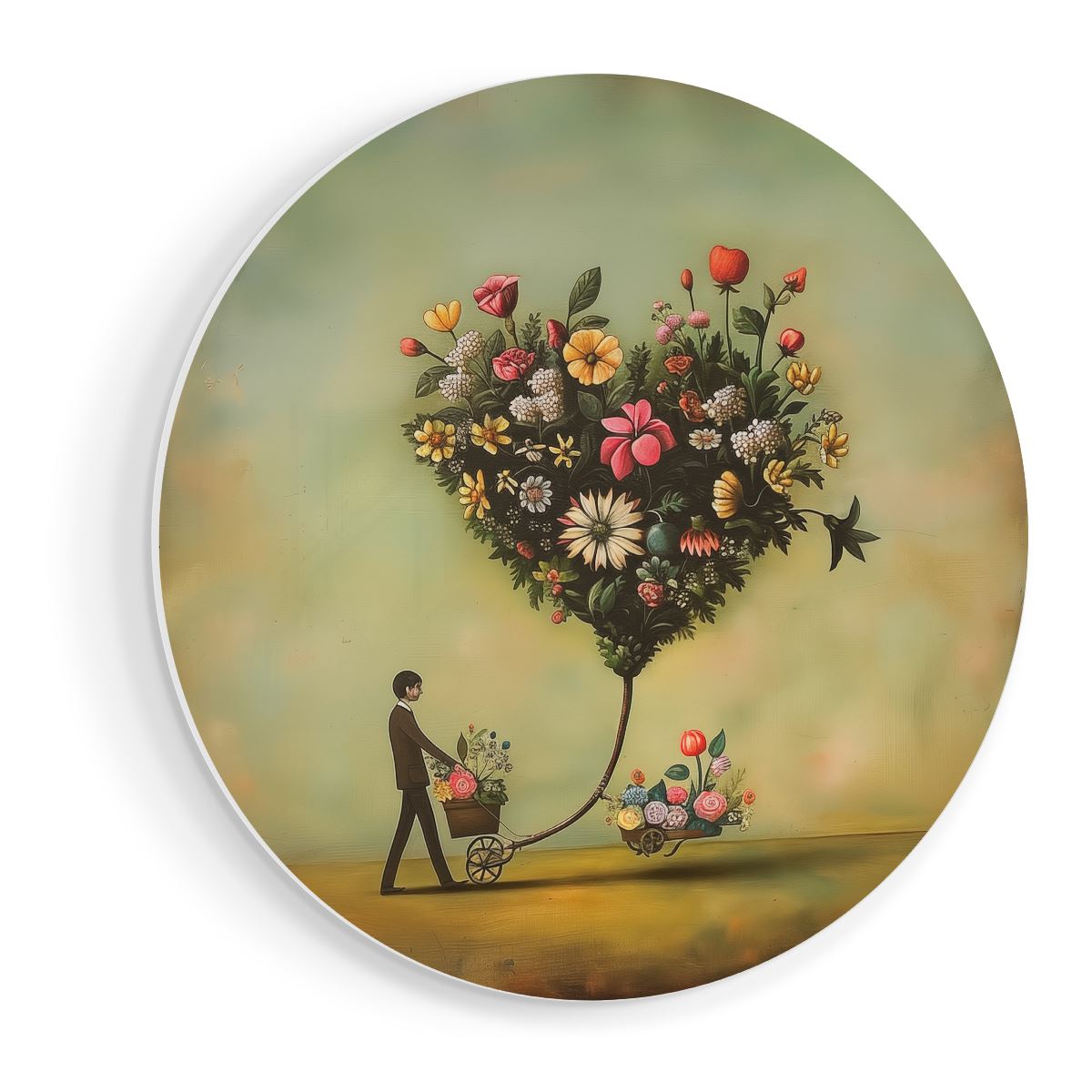 Wandcirkel Man die een Kar Voortduwt met een Hartvormig Boeket Bloemen