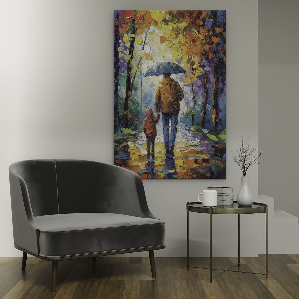 Schilderij Man en een Kind Lopen in de Regen met een Paraplu