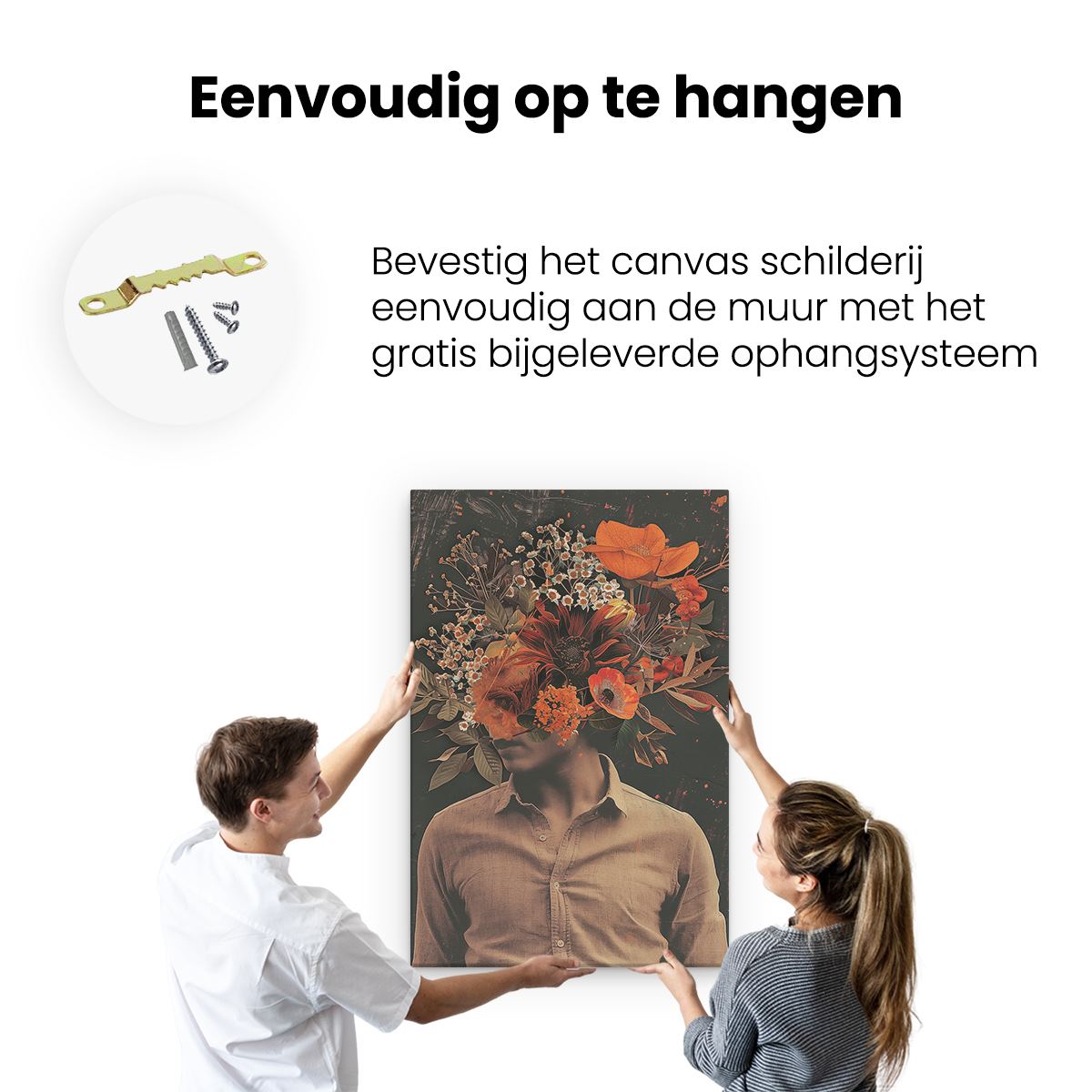 Bij aankoop ontvang je een meegeleverd ophangsysteem, zodat je op een simpele en snelle wijze het schilderij boven de bank of bed kan monteren.