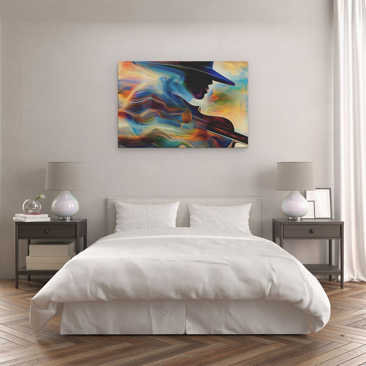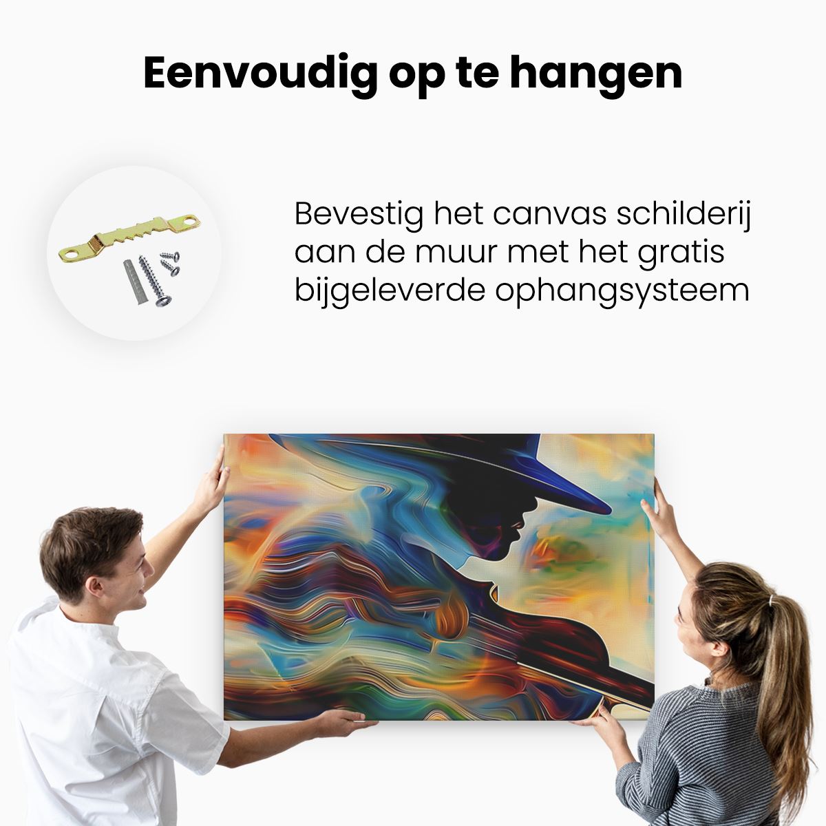Bij aankoop ontvang je een meegeleverd ophangsysteem, zodat je op een simpele en snelle wijze het schilderij boven de bank of bed kan monteren.