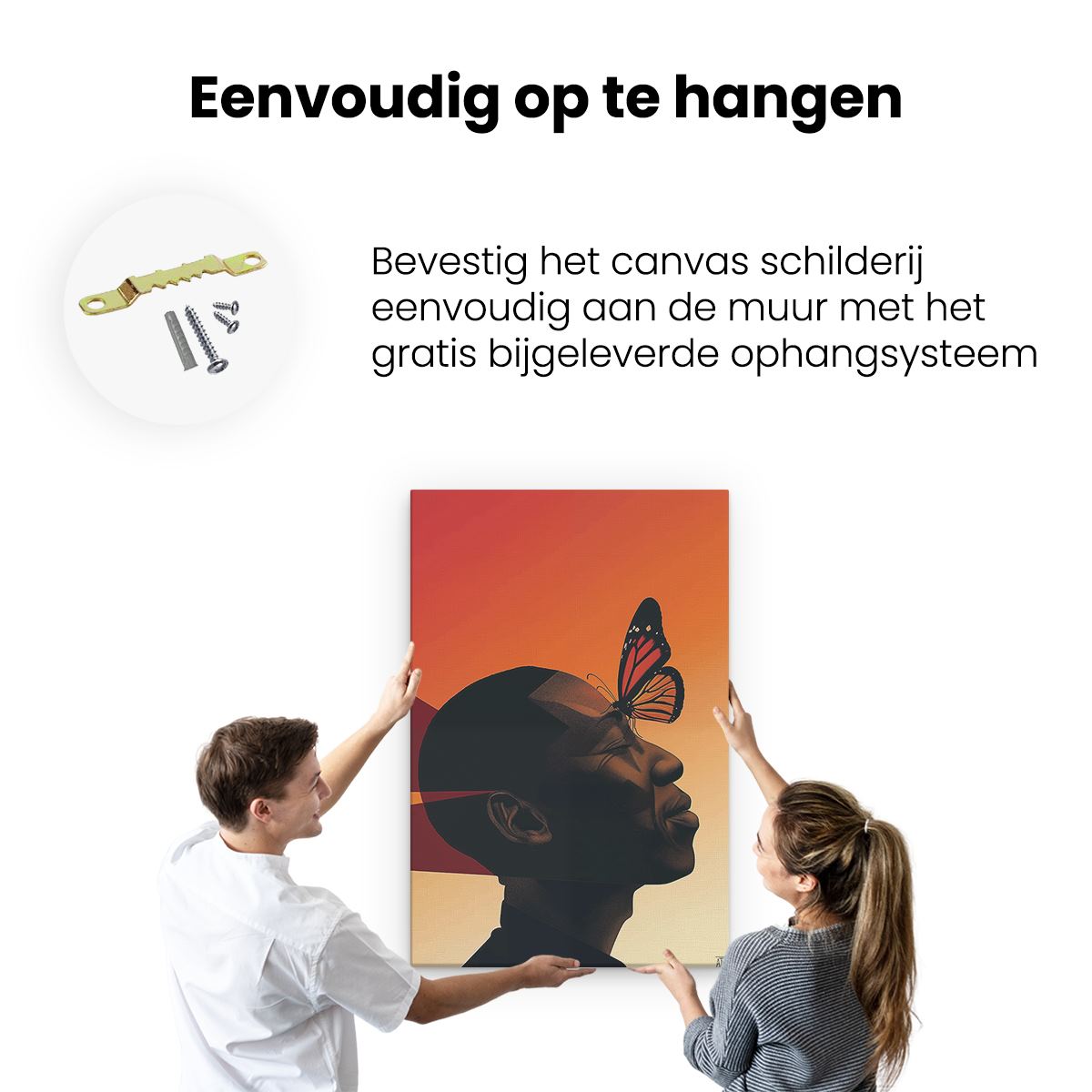 Bij aankoop ontvang je een meegeleverd ophangsysteem, zodat je op een simpele en snelle wijze het schilderij boven de bank of bed kan monteren.