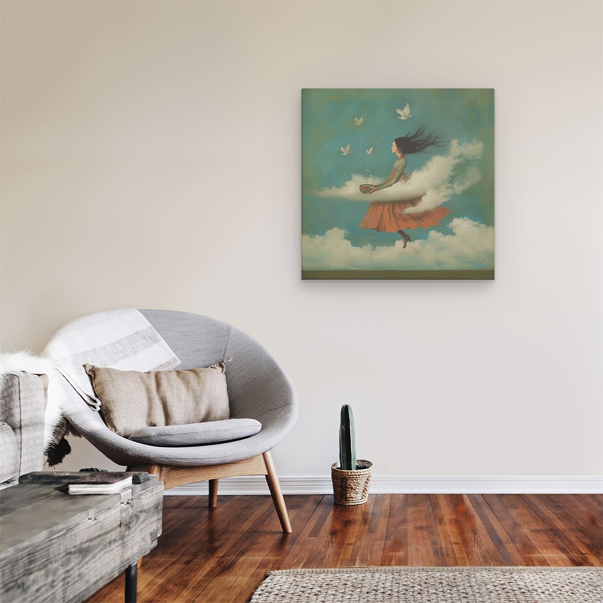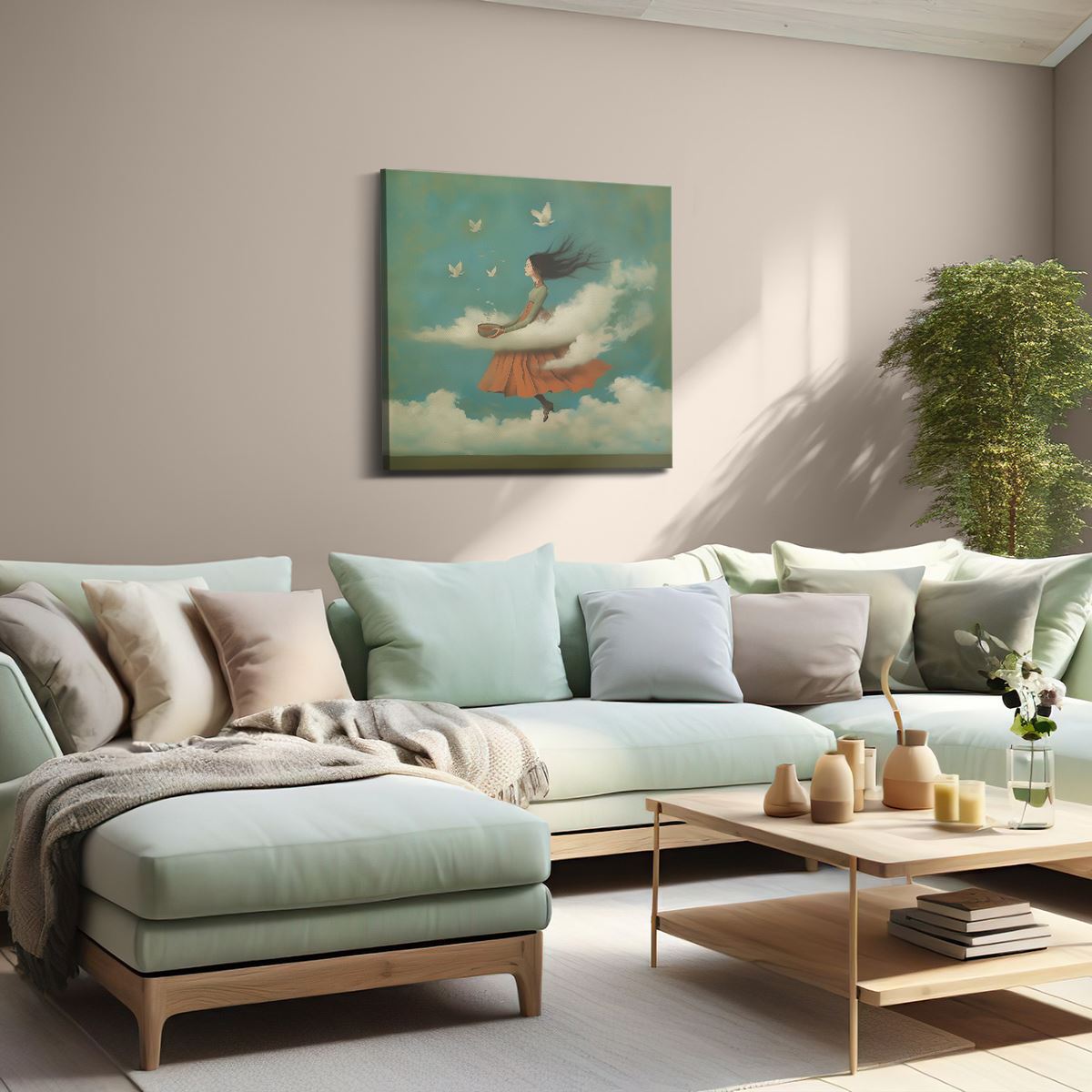 Schilderij Meisje in een Oranje Jurk die in de Wolken Vliegt