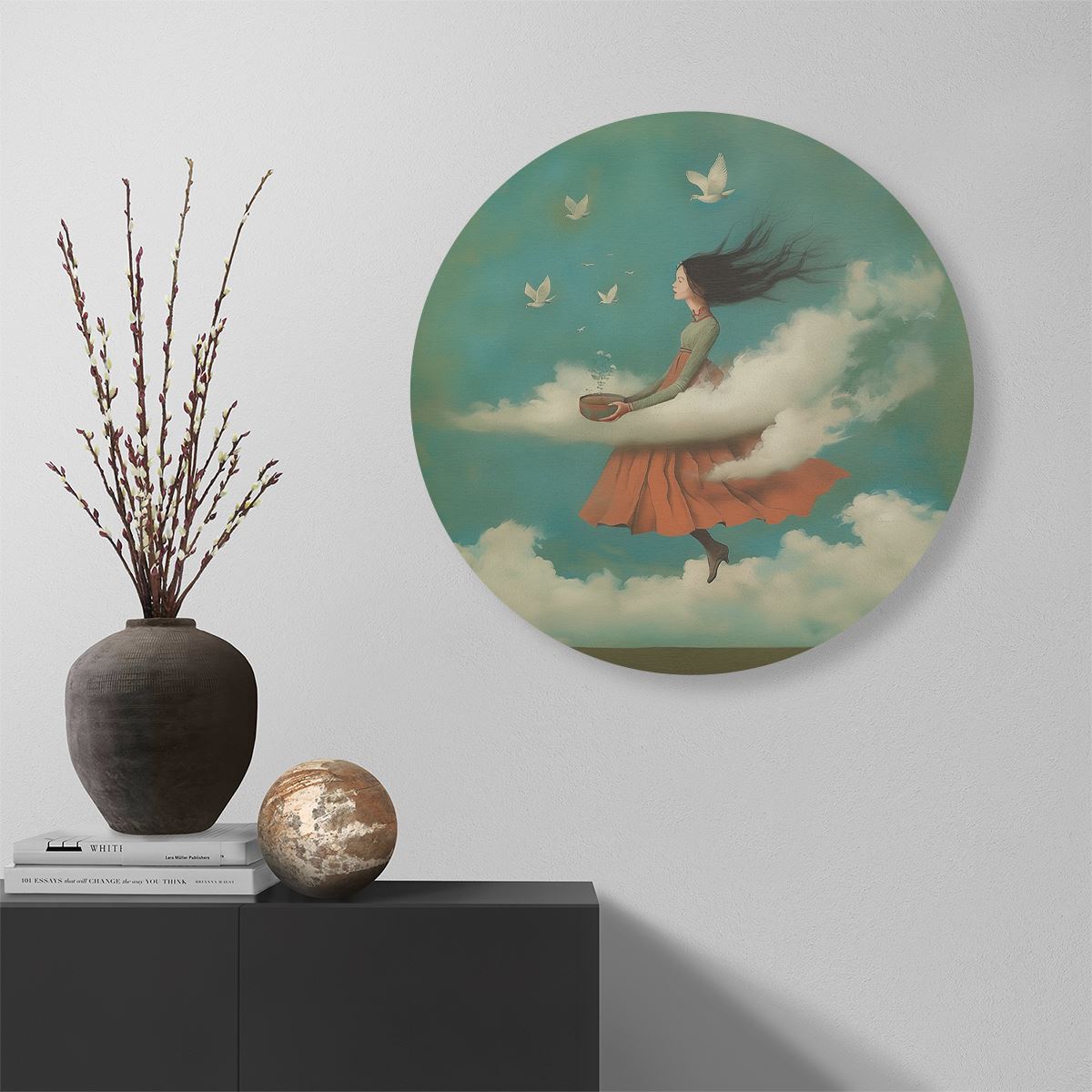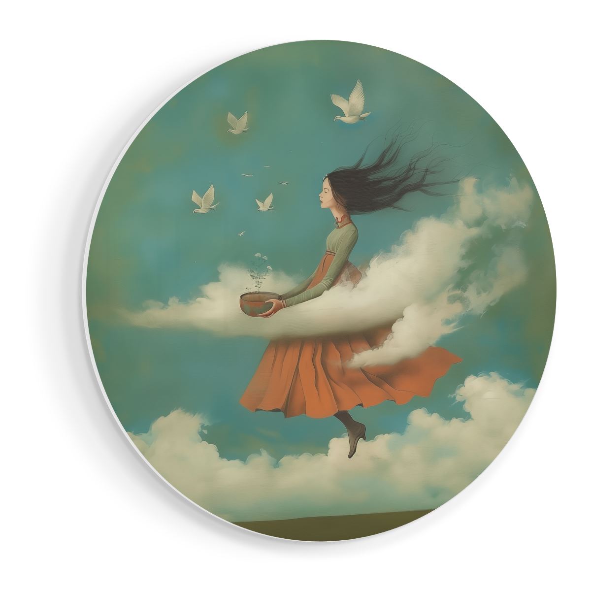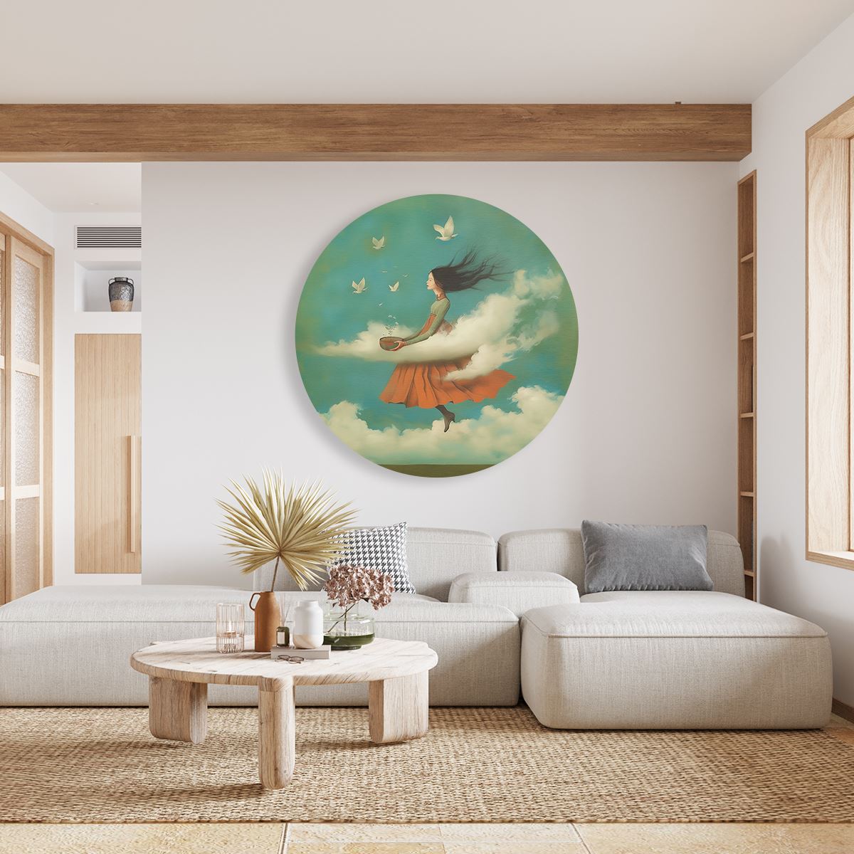Wandcirkel Meisje in een Oranje Jurk die in de Wolken Vliegt