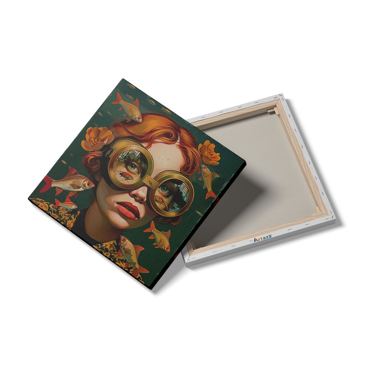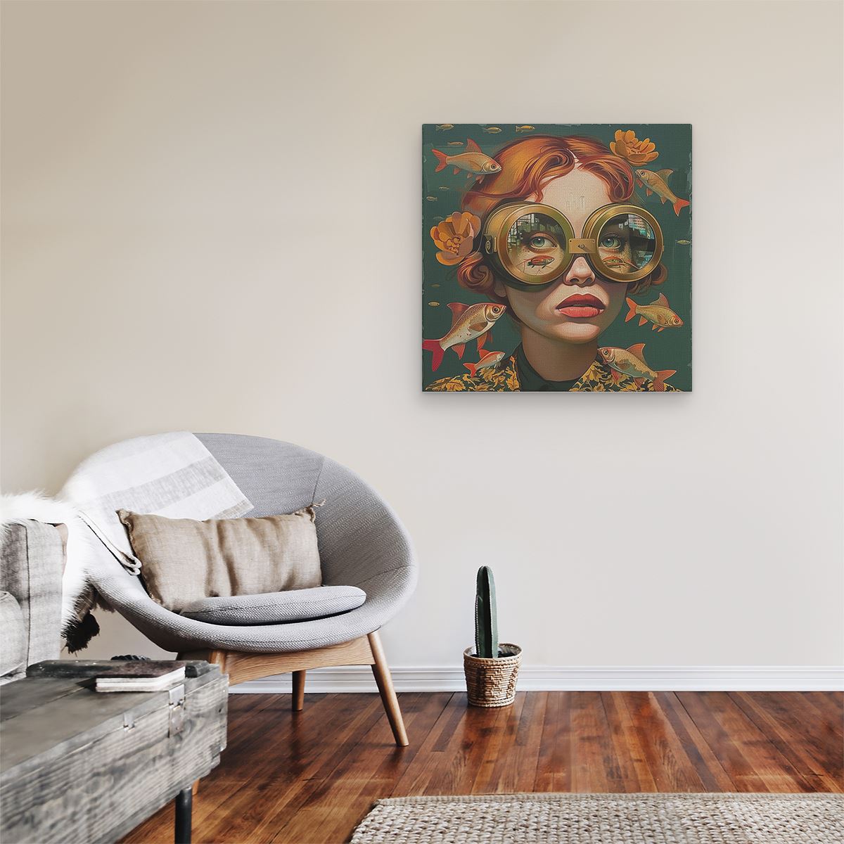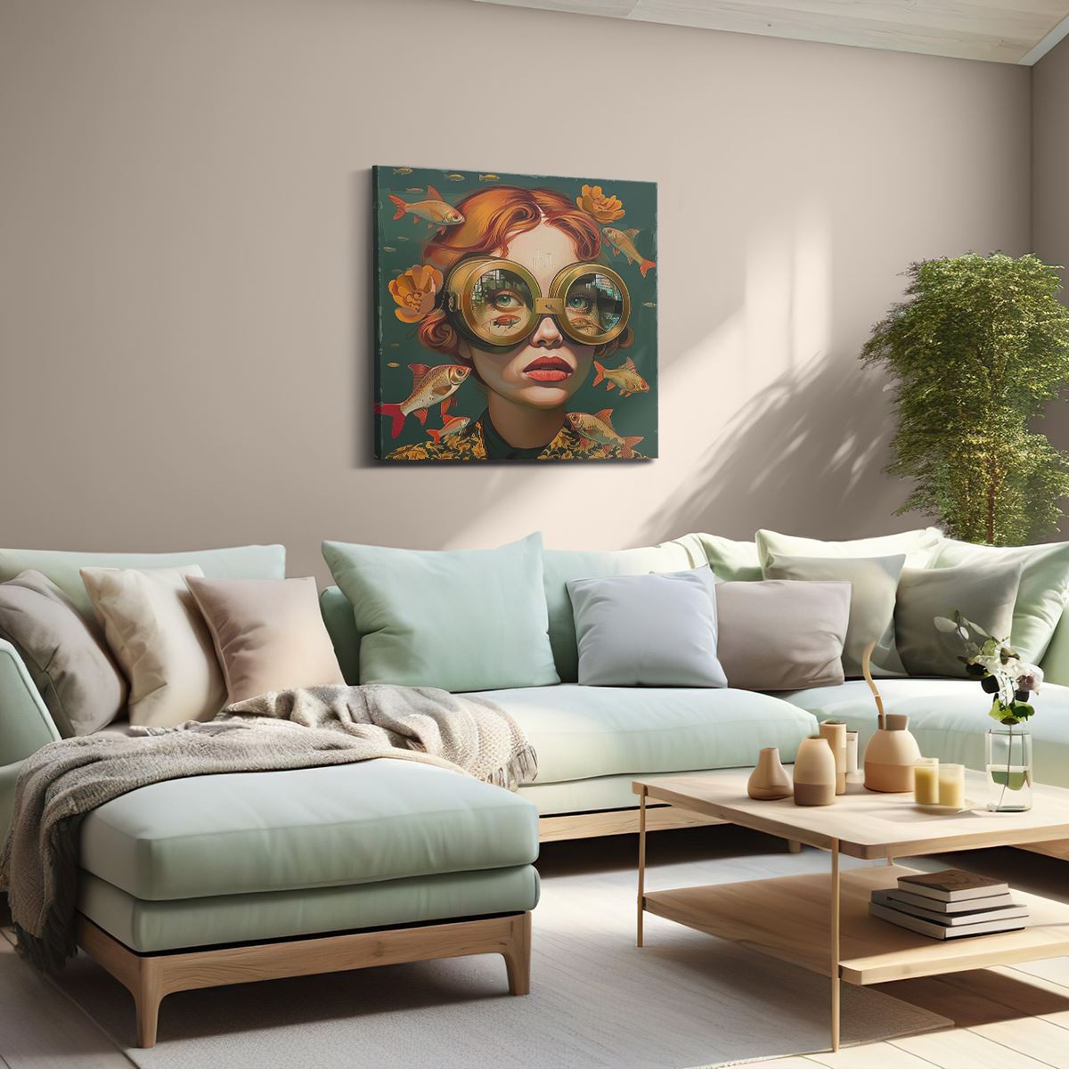 Schilderij Meisje met een Bril en Omringd door Vissen