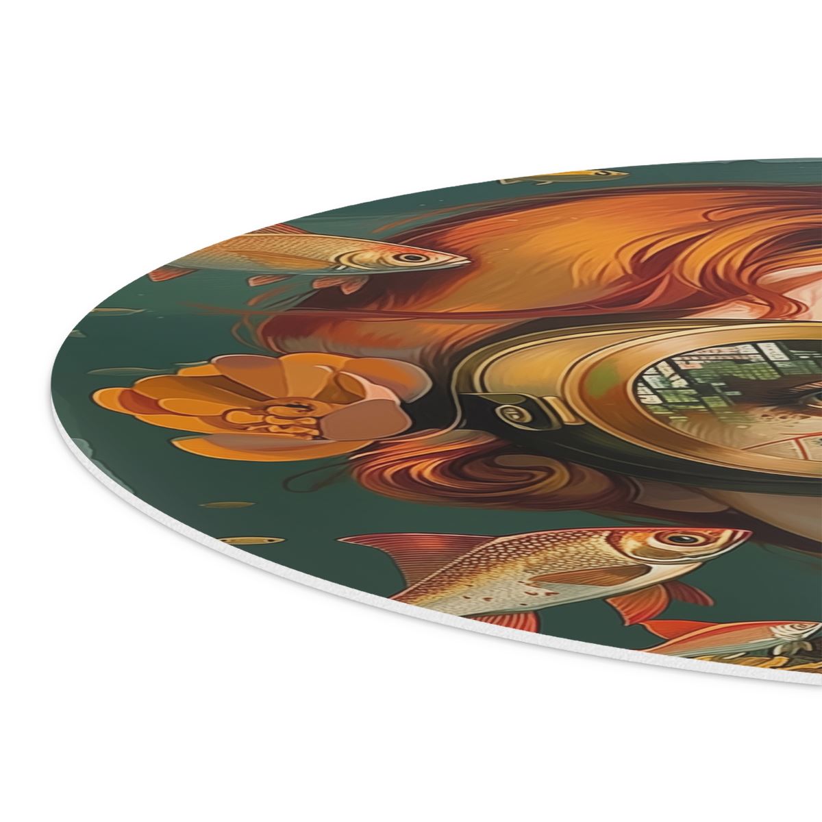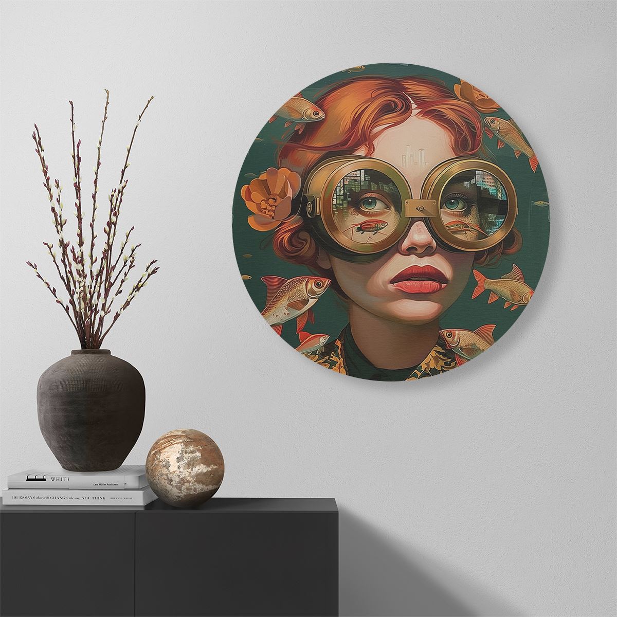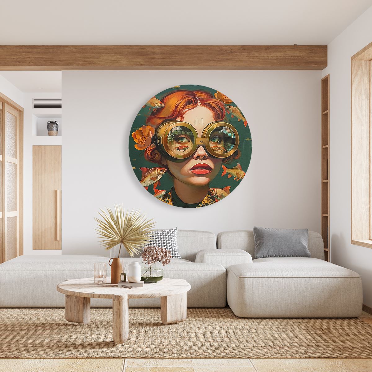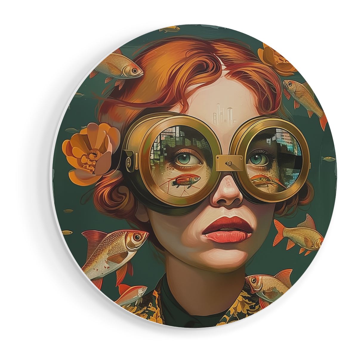 Wandcirkel Meisje met een Bril en Omringd door Vissen