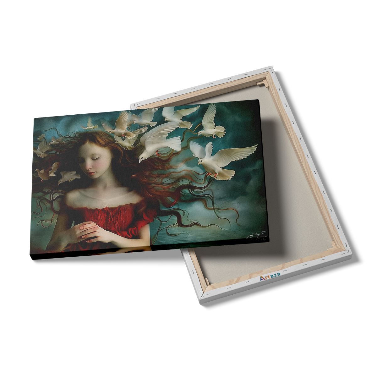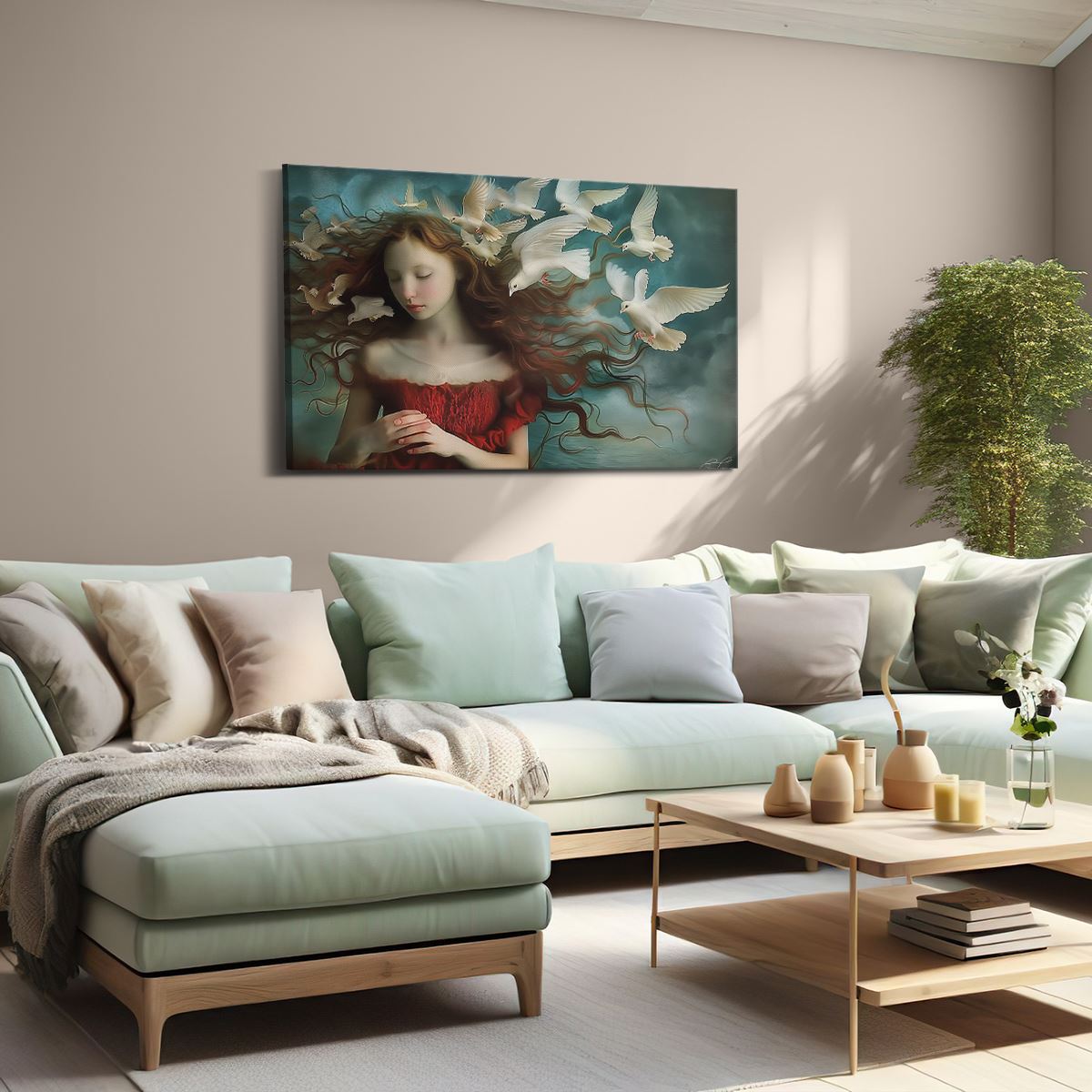 Schilderij Meisje met een Rode Jurk en Witte Duiven
