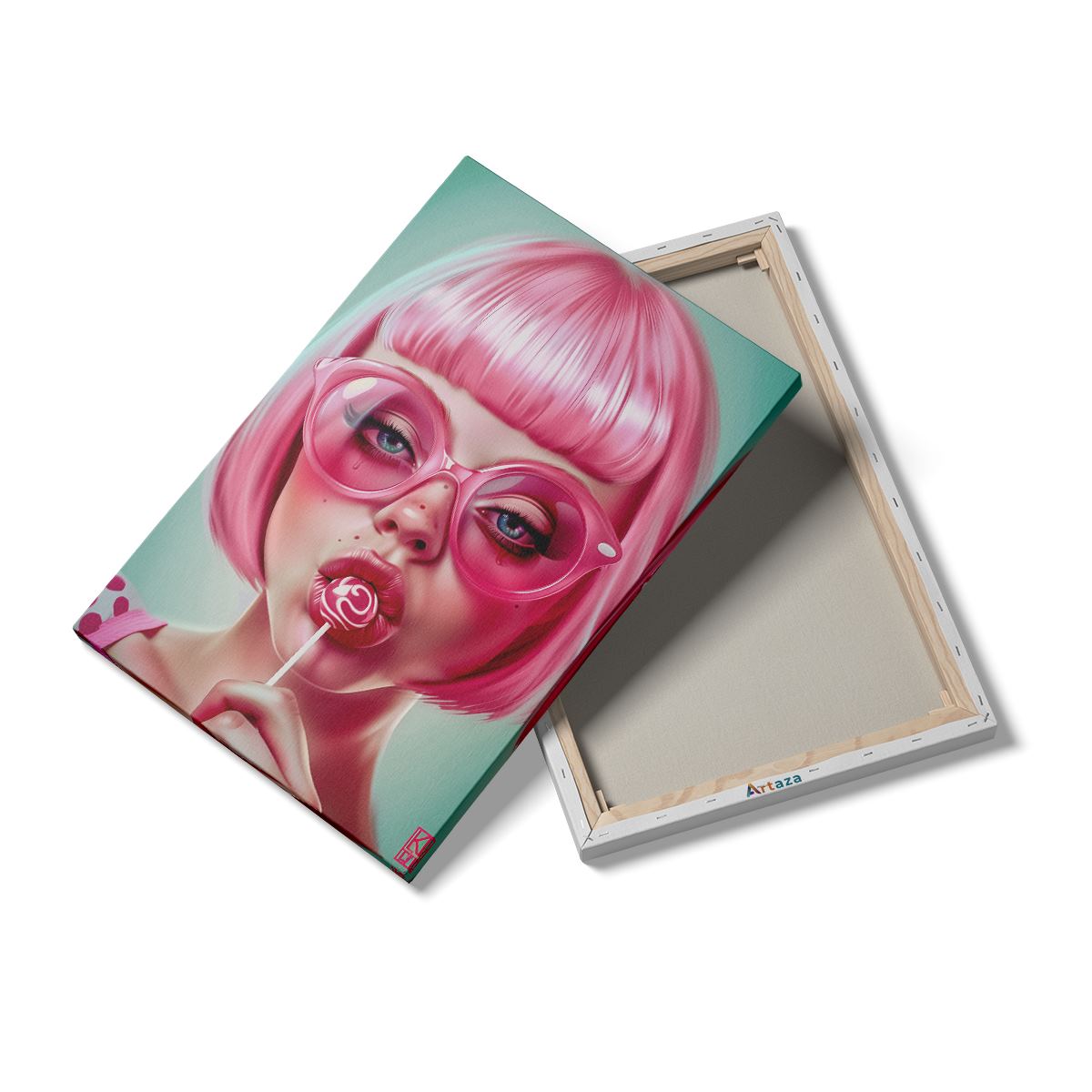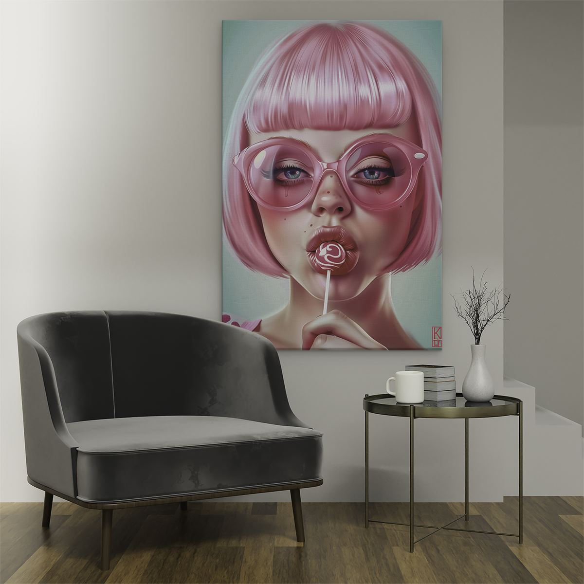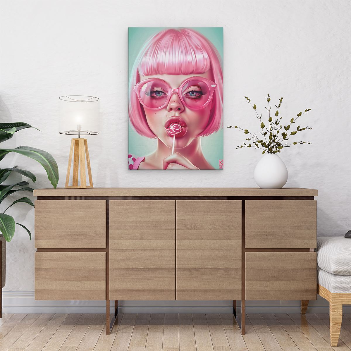 Schilderij Meisje met Roze haar en Bril Eet een Lolly