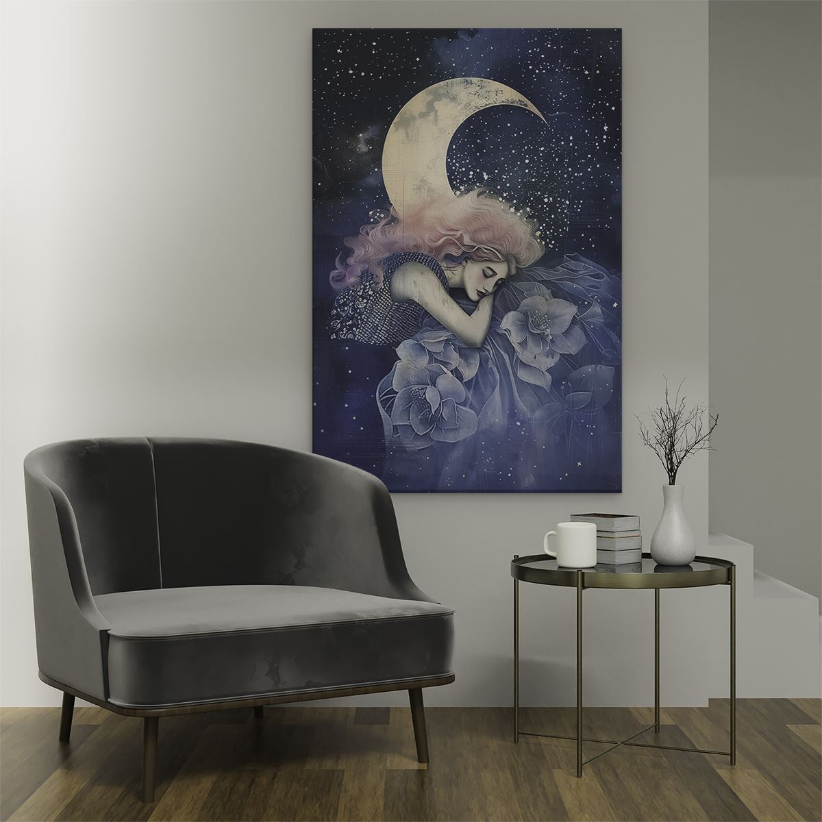 Schilderij Meisje met Roze haar Slaapt op de Maan