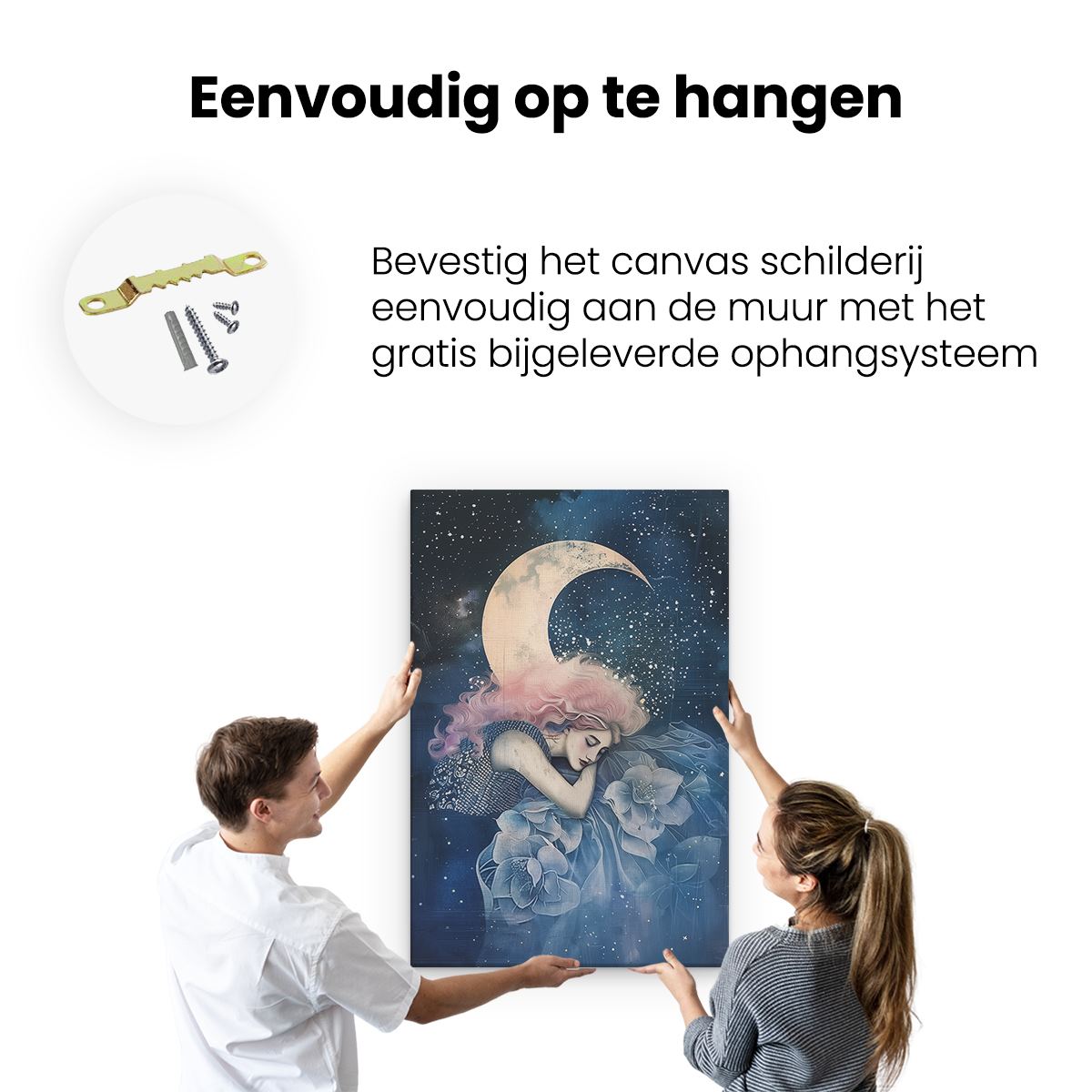 Bij aankoop ontvang je een meegeleverd ophangsysteem, zodat je op een simpele en snelle wijze het schilderij boven de bank of bed kan monteren.