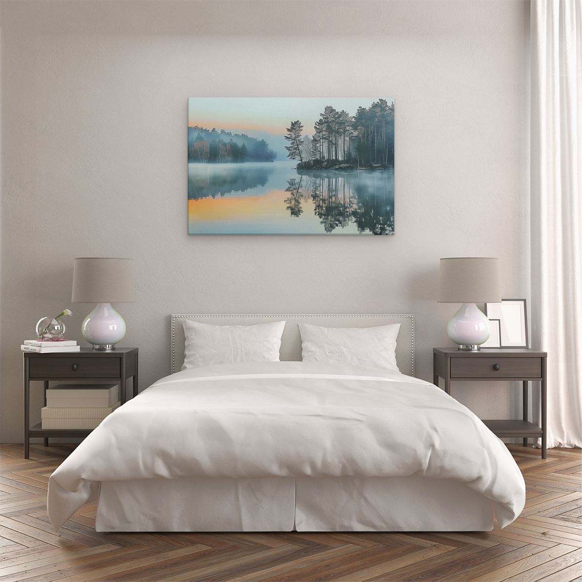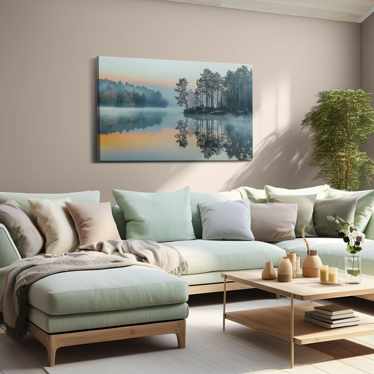Schilderij Mistig Meer met Bomen erin Weerspiegeld