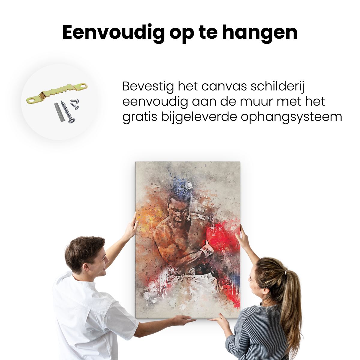 Bij aankoop ontvang je een meegeleverd ophangsysteem, zodat je op een simpele en snelle wijze het schilderij boven de bank of bed kan monteren.