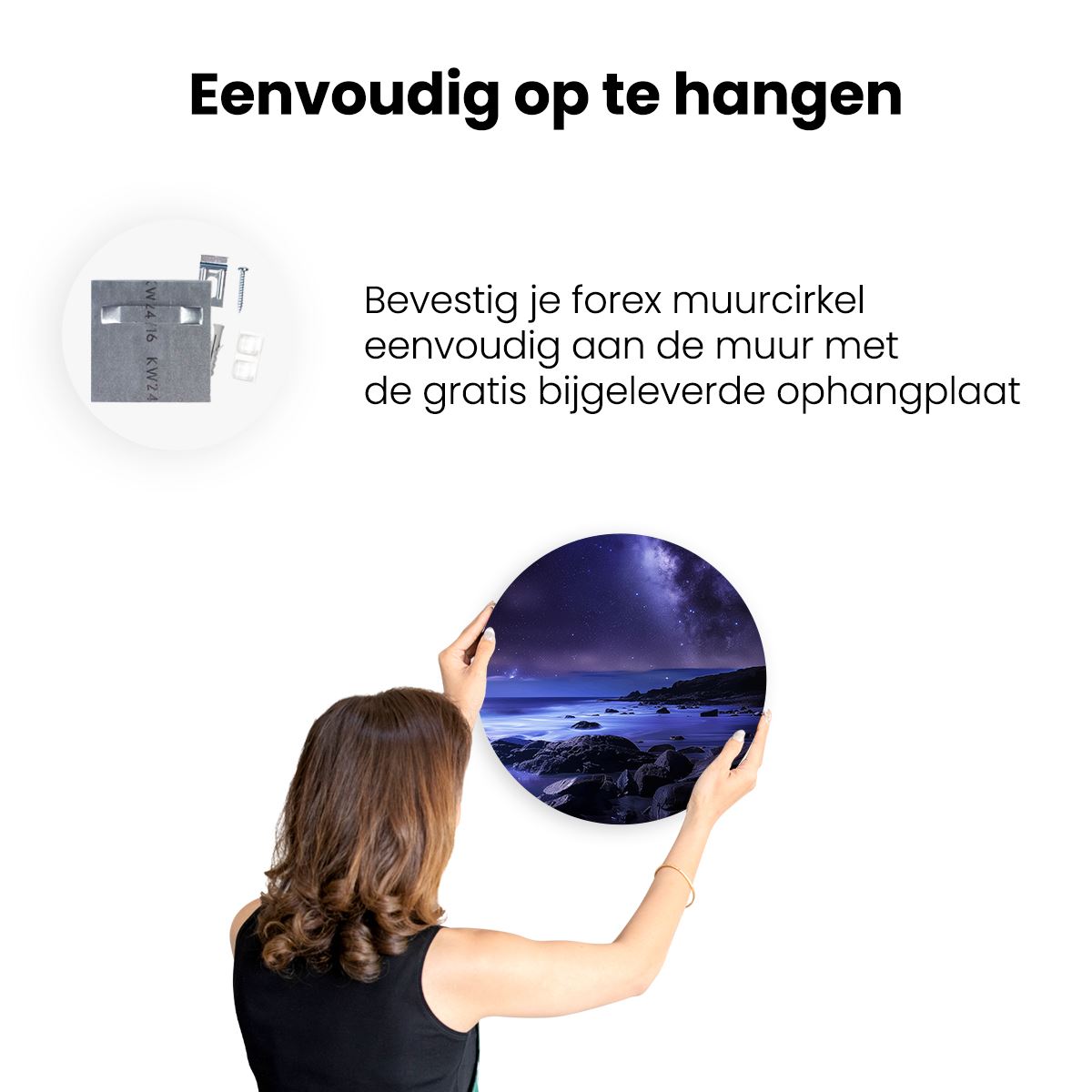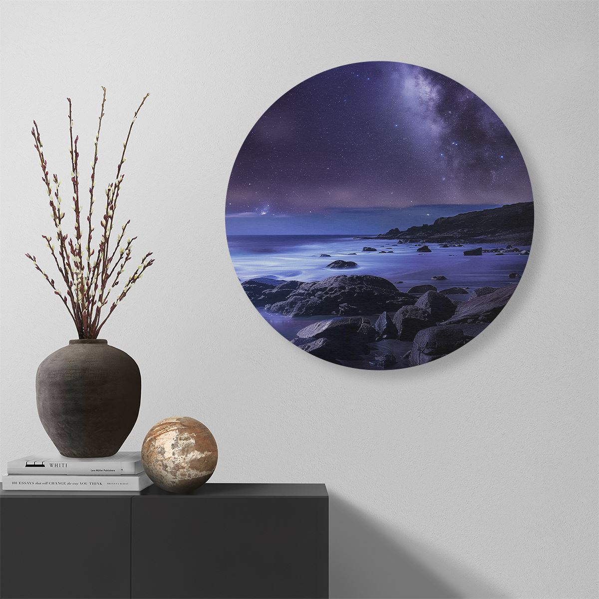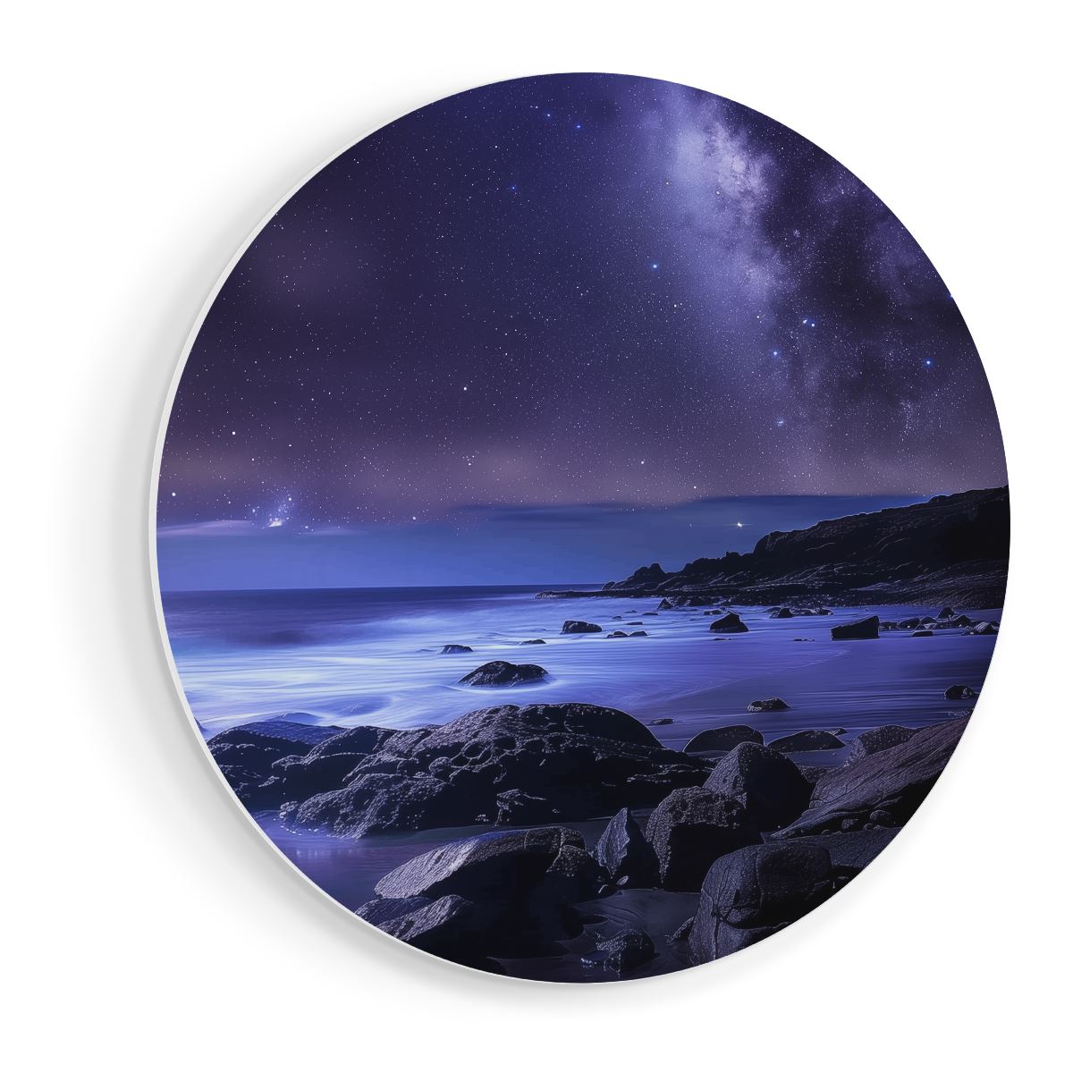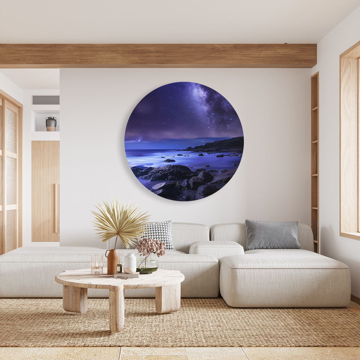 Wandcirkel Nachtelijke Hemel met Sterren en een Rotsachtig Strand