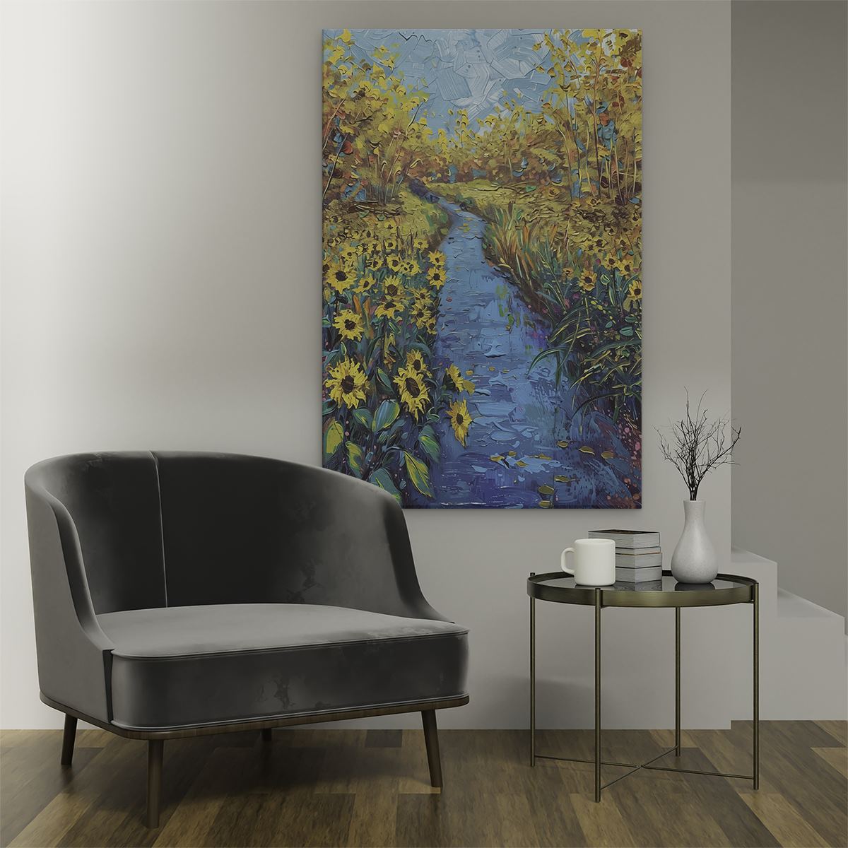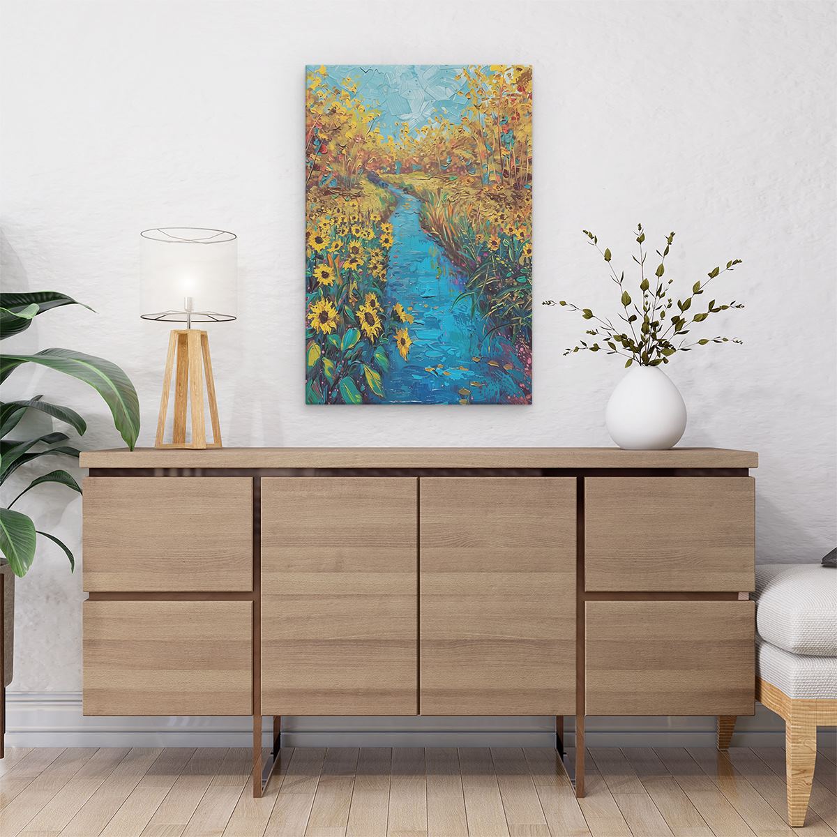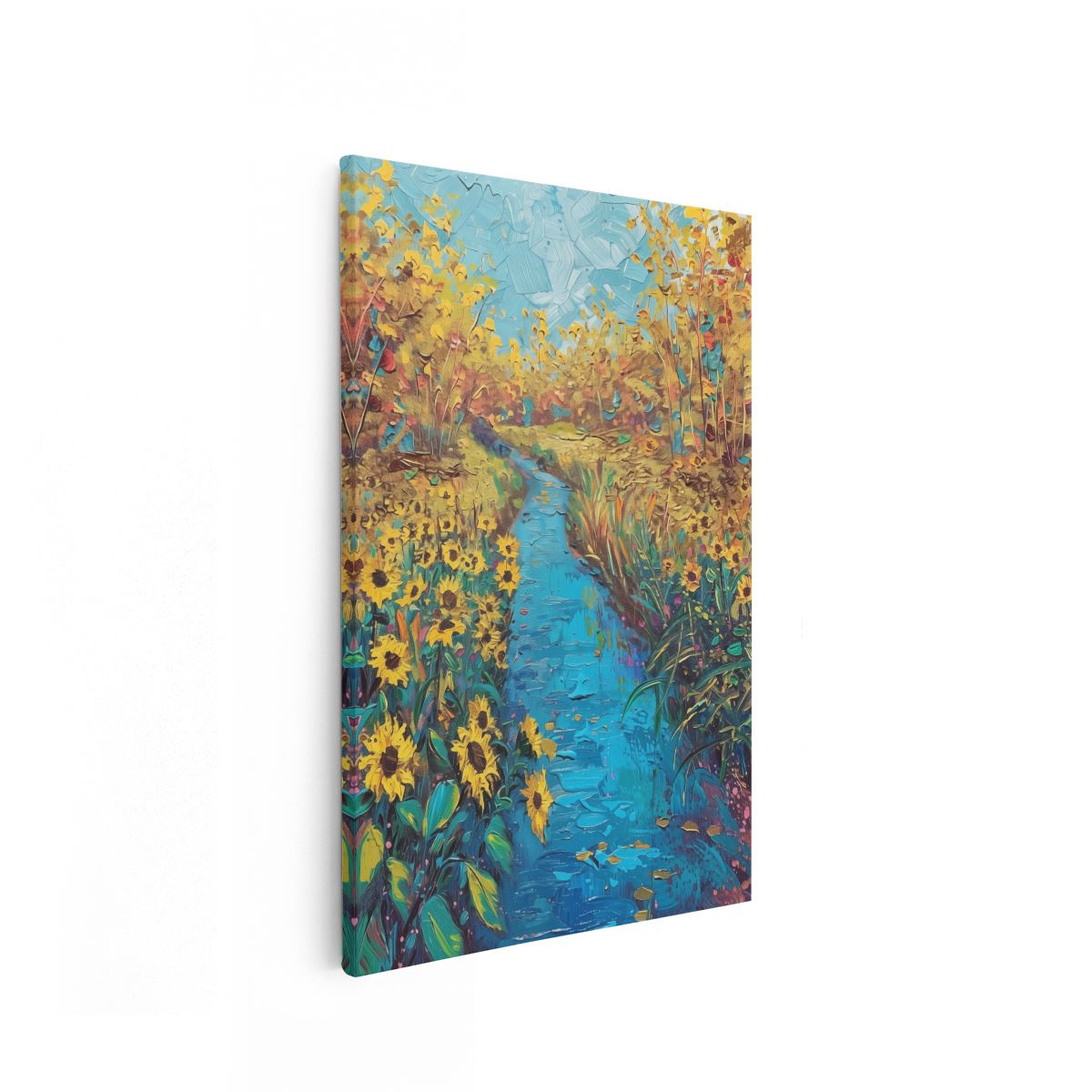 Schilderij Olieverfschilderij van een Beekje en Zonnebloemen