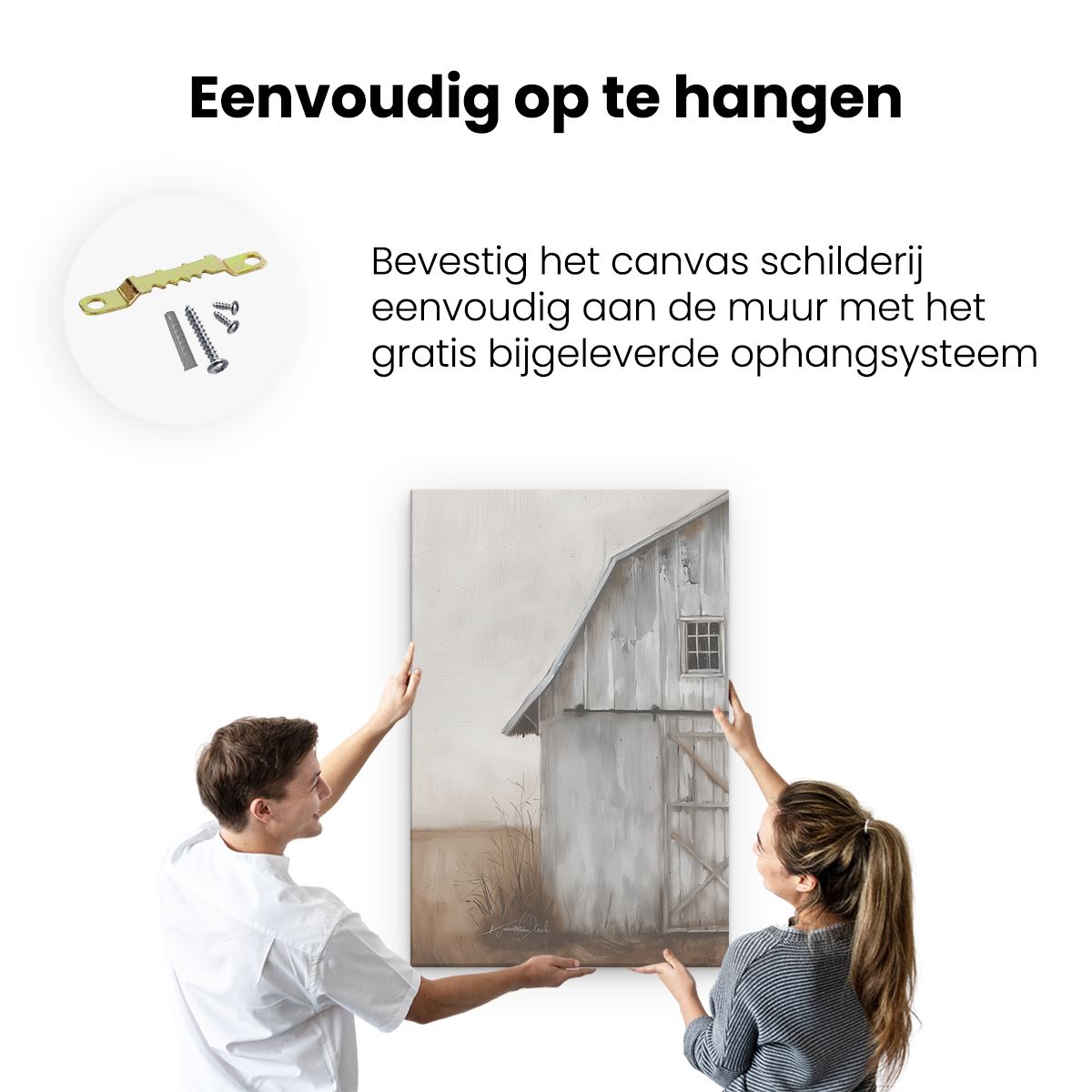 Bij aankoop ontvang je een meegeleverd ophangsysteem, zodat je op een simpele en snelle wijze het schilderij boven de bank of bed kan monteren.