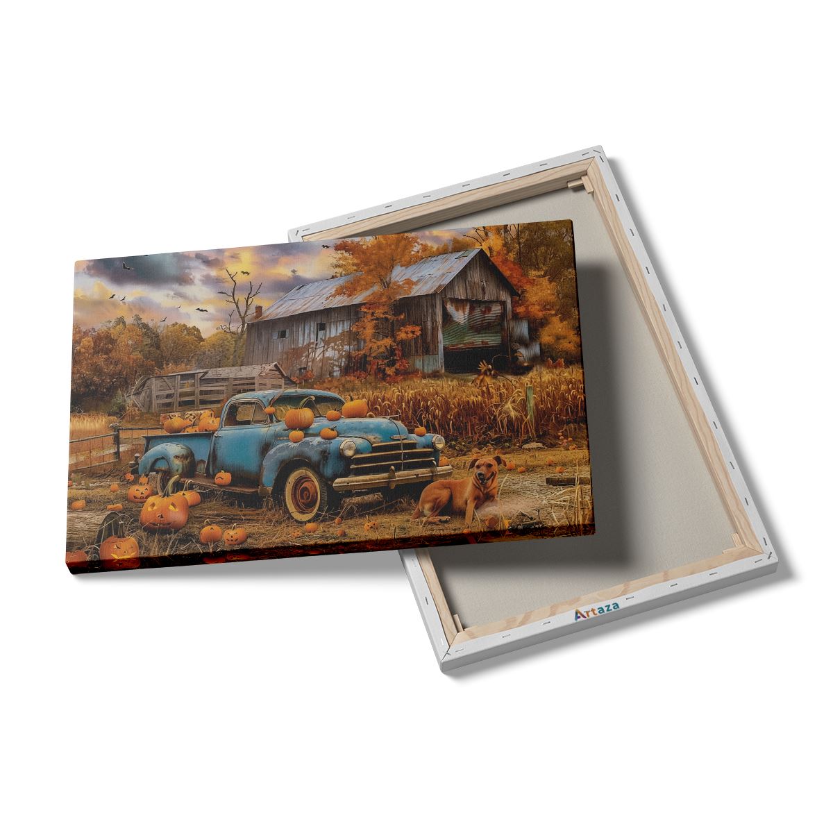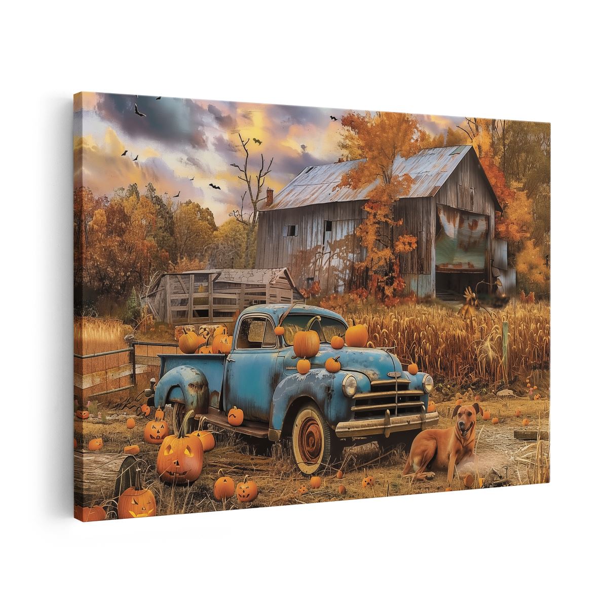 Schilderij Oude Vrachtwagen met Pompoenen voor een Schuur