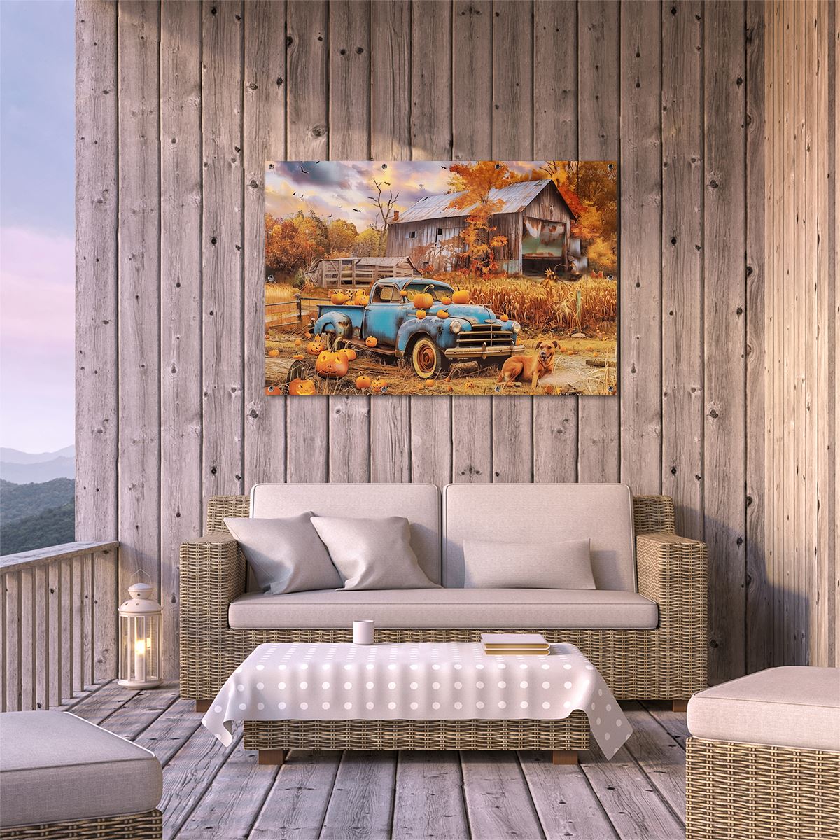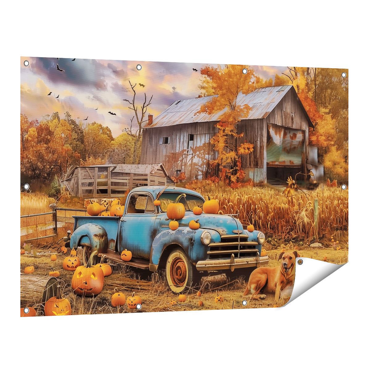 Tuinposter Oude Vrachtwagen met Pompoenen voor een Schuur