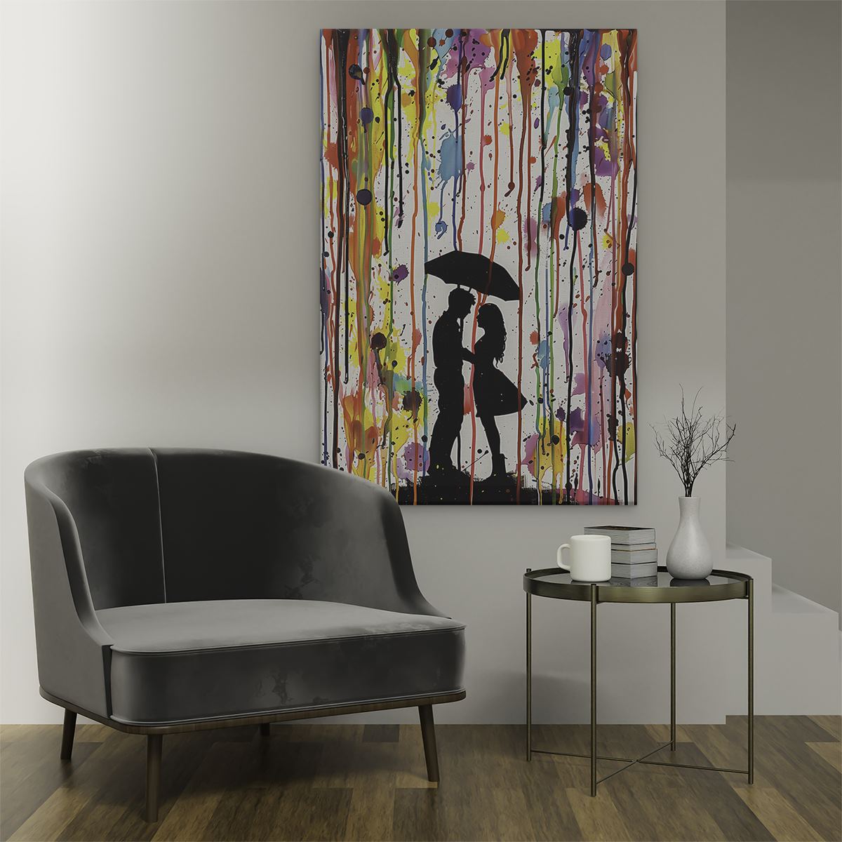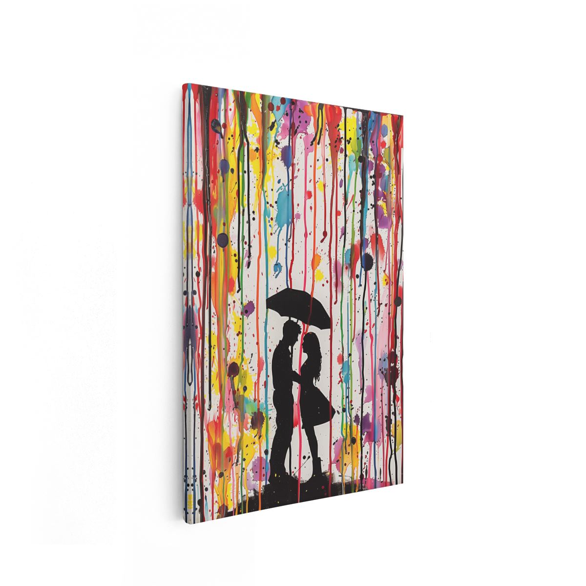 Schilderij Paar Kussen onder een Kleurrijke Paraplu