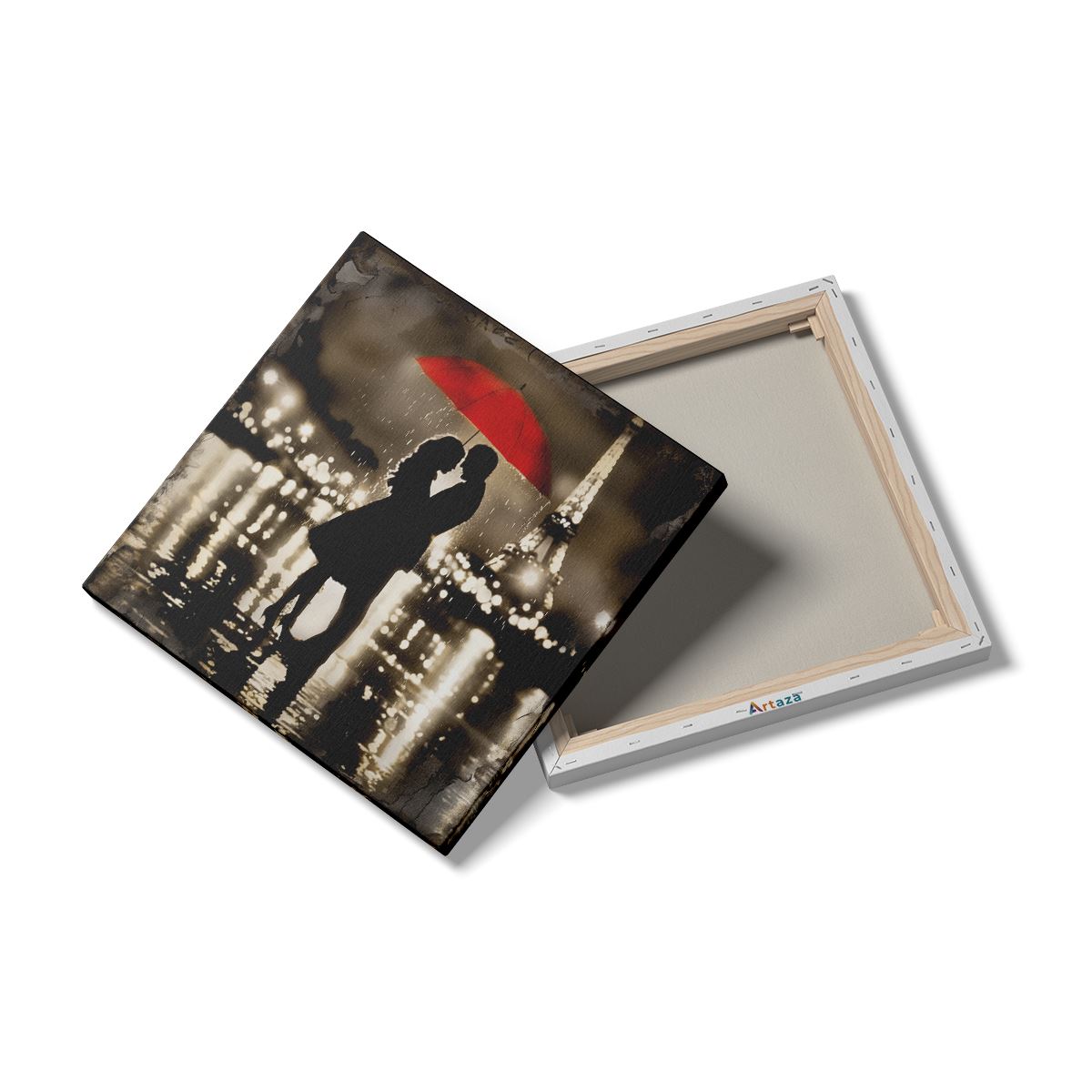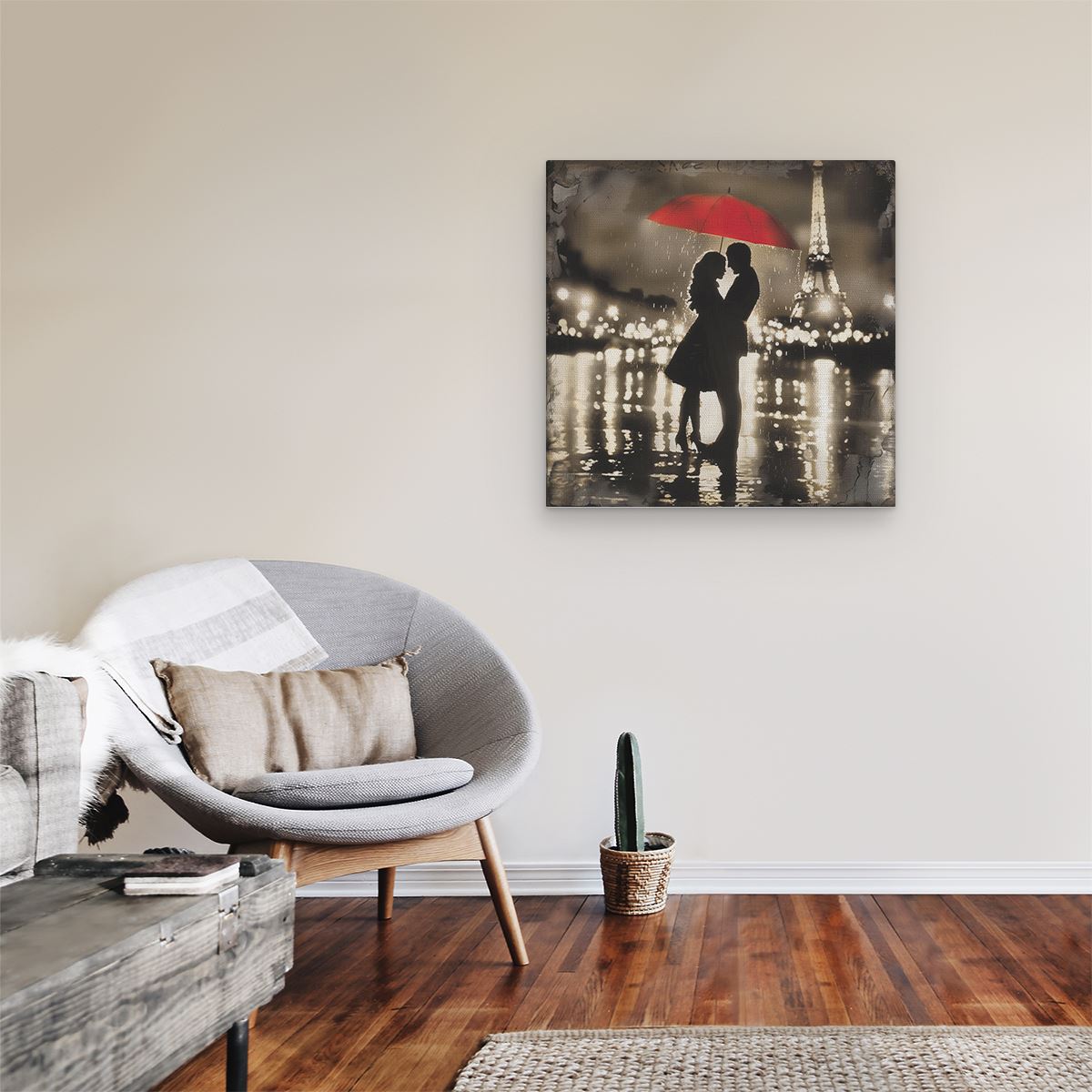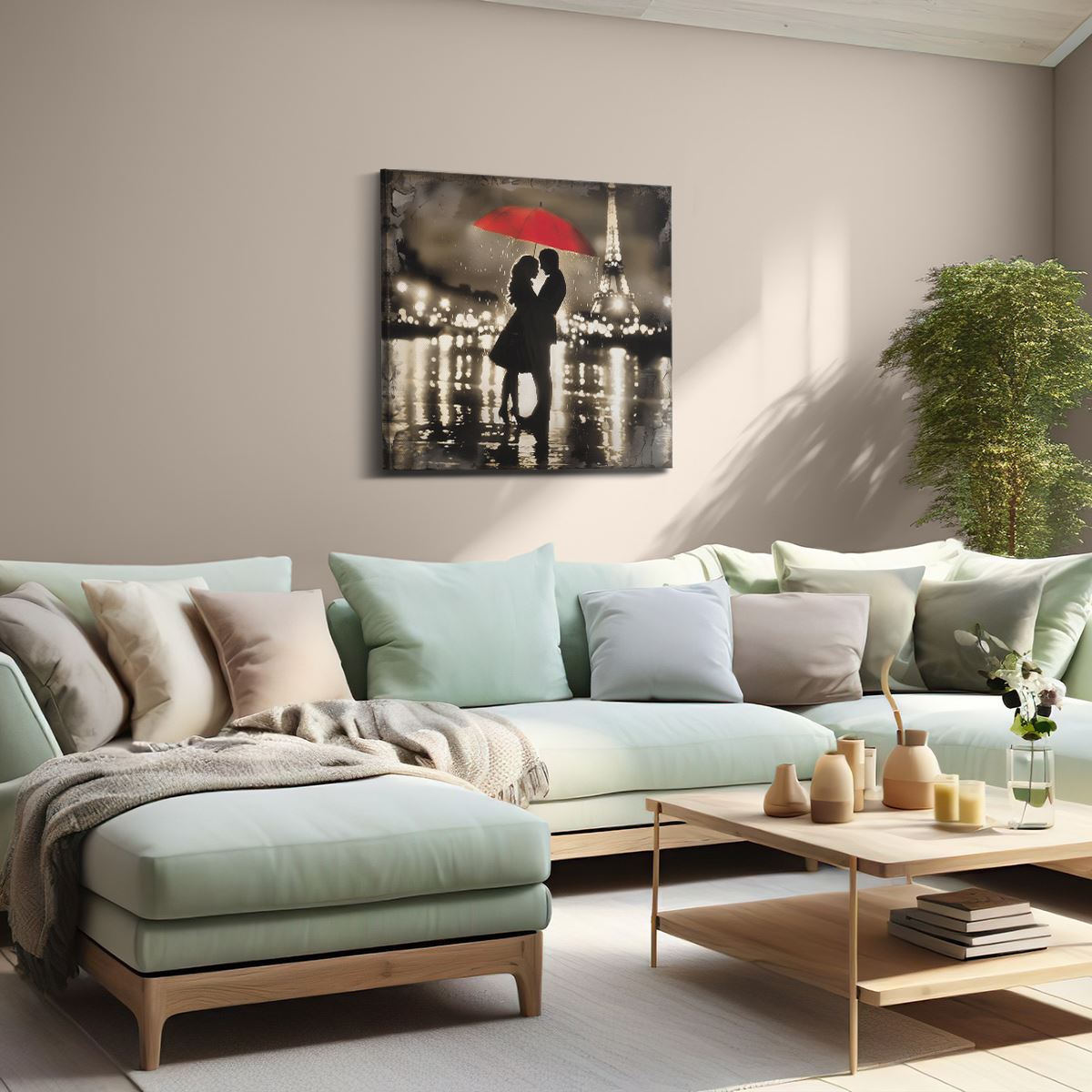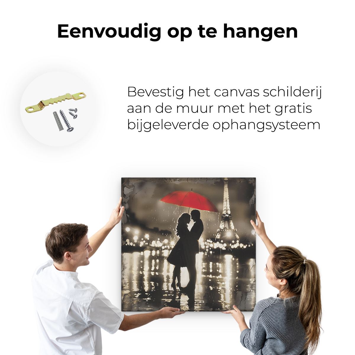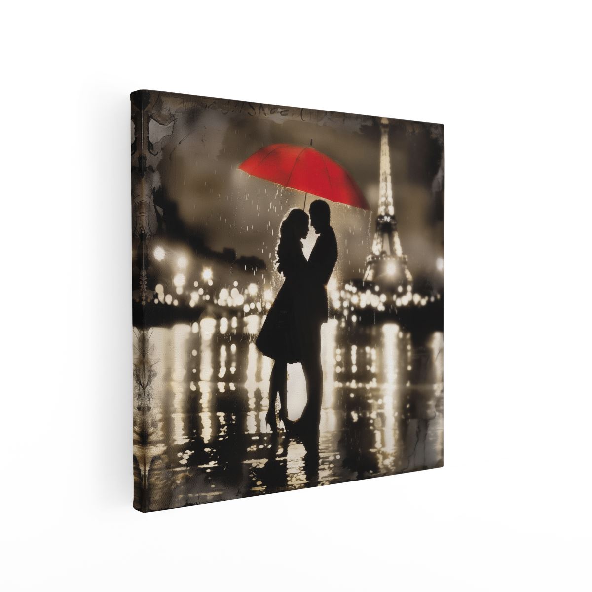 Schilderij Paar Kussen onder een Rode Paraplu met de Eiffeltoren op de Achtergrond