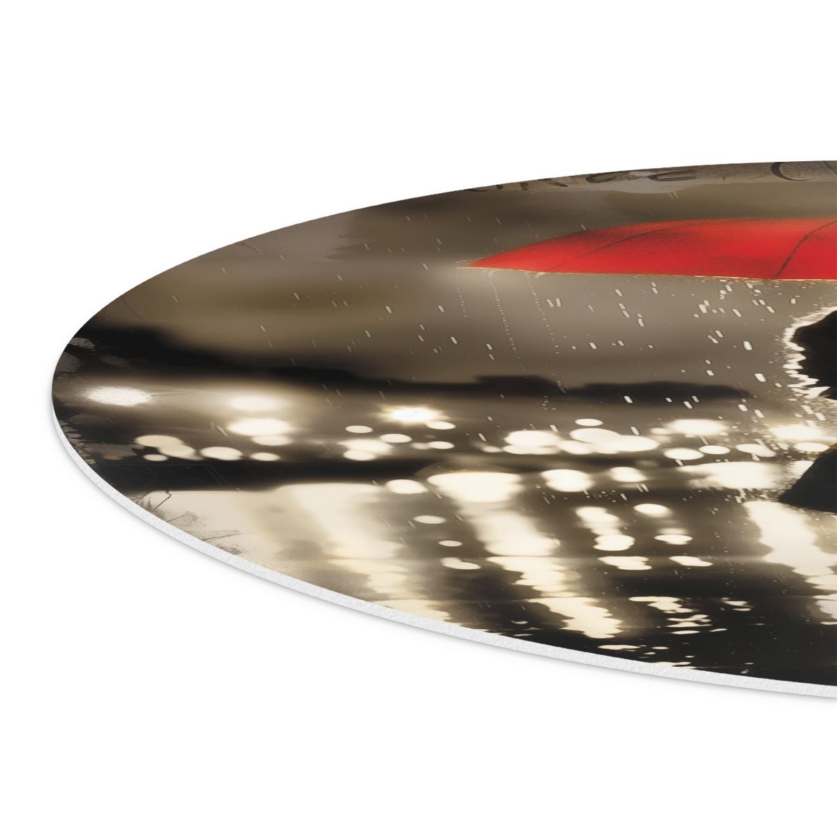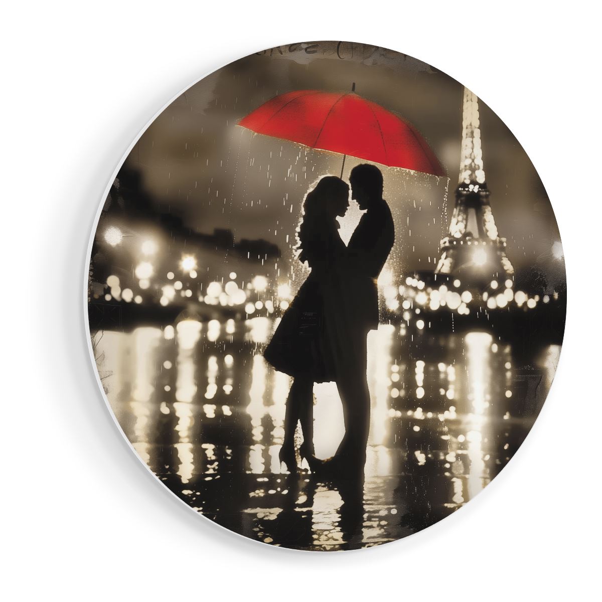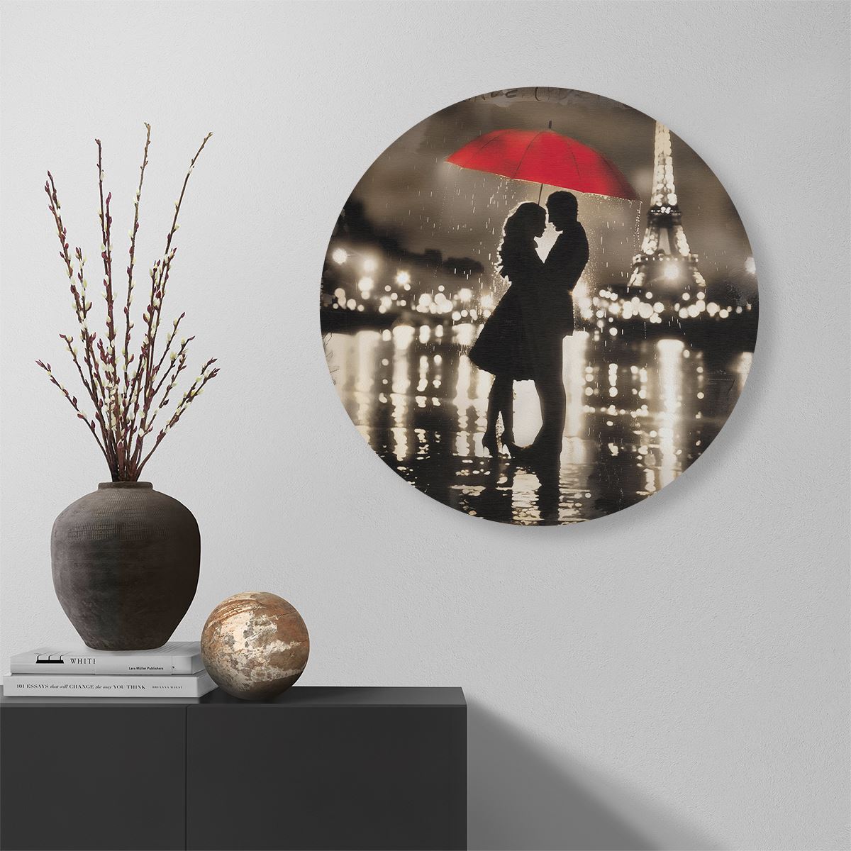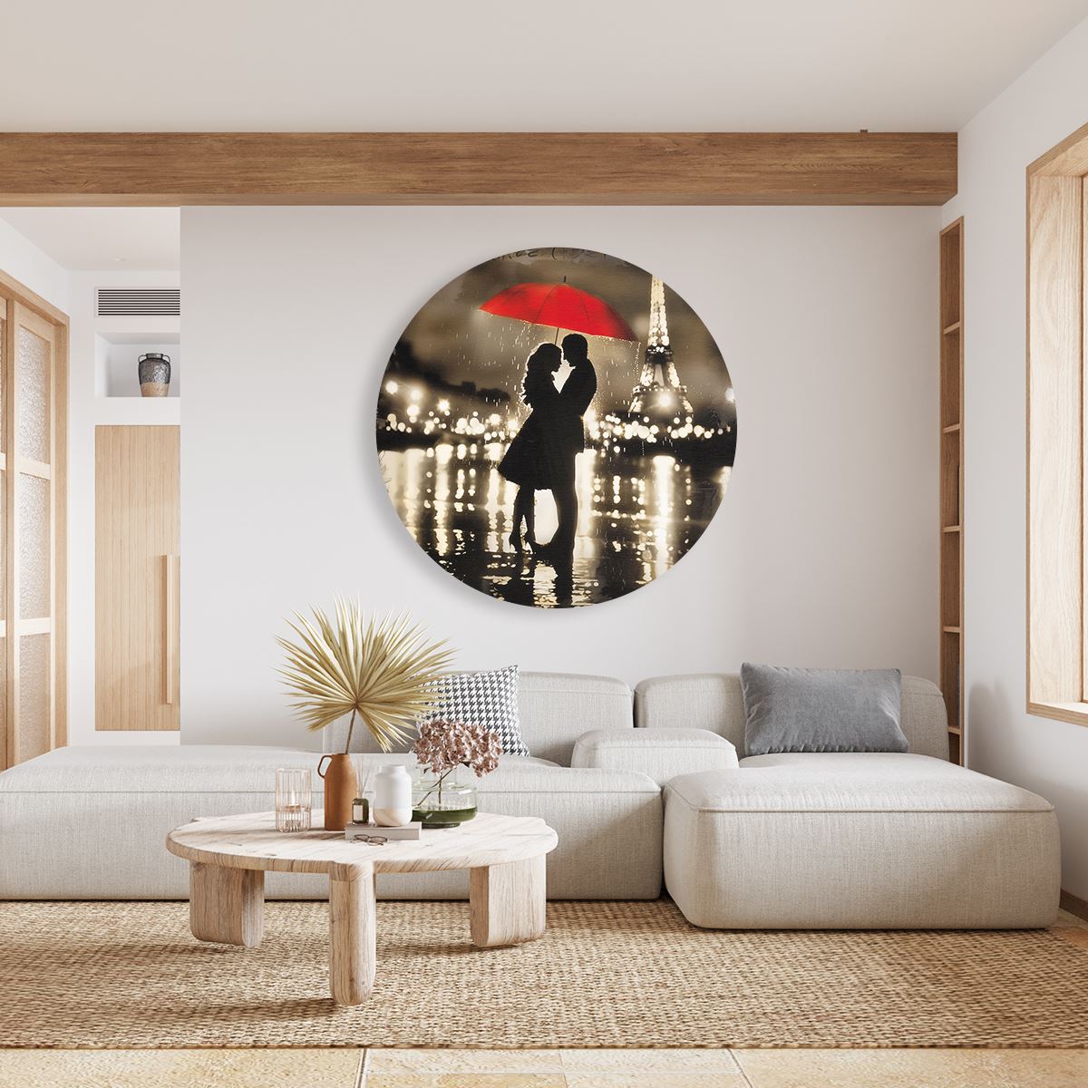 Wandcirkel Paar Kussen onder een Rode Paraplu met de Eiffeltoren op de Achtergrond