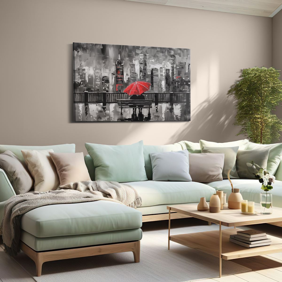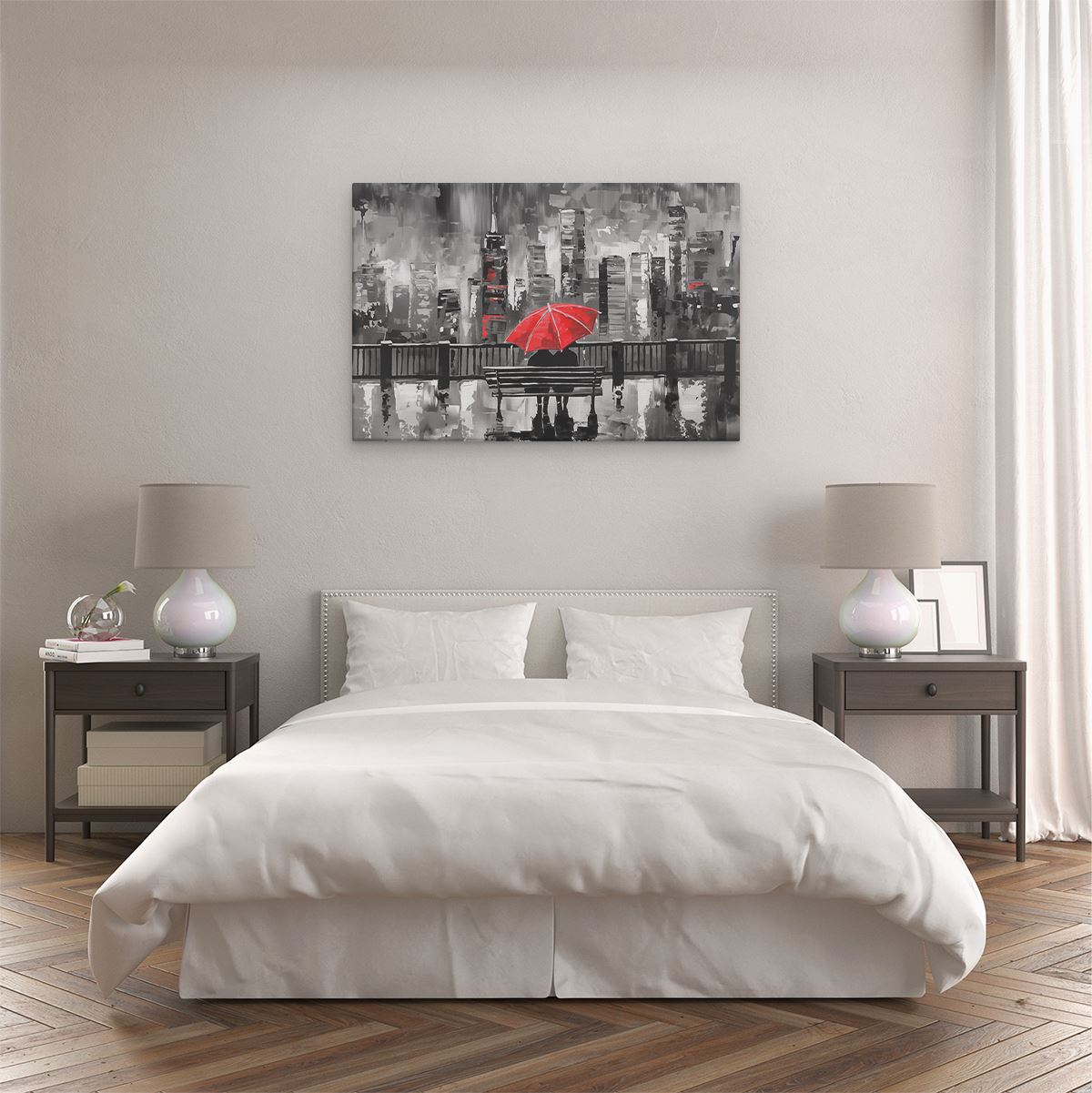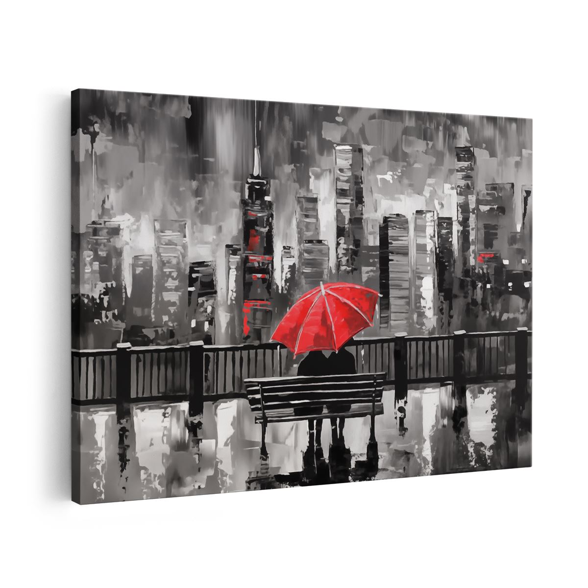Schilderij Paar Zittend op een Bankje met een Rode Paraplu