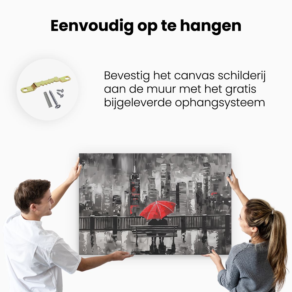 Bij aankoop ontvang je een meegeleverd ophangsysteem, zodat je op een simpele en snelle wijze het schilderij boven de bank of bed kan monteren.