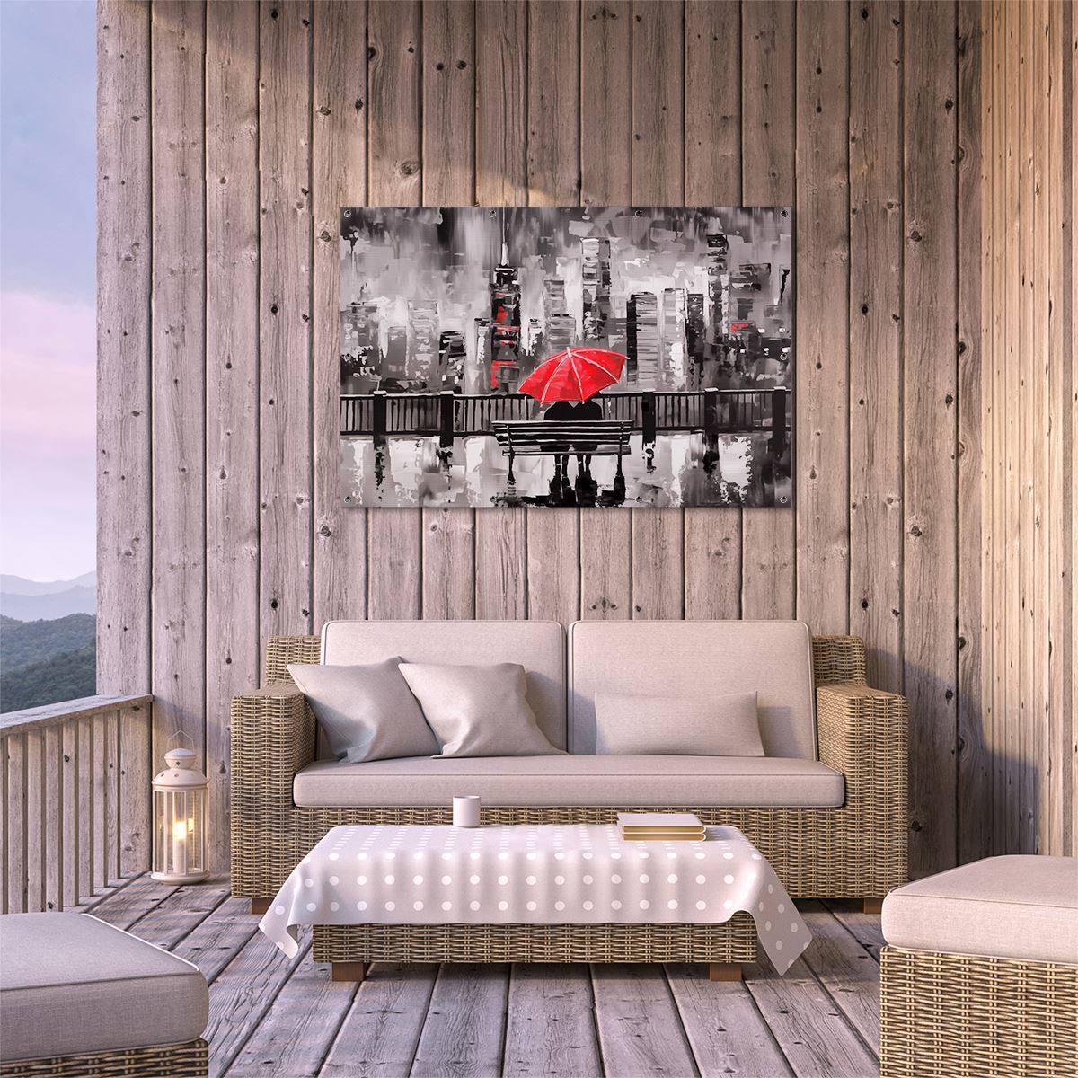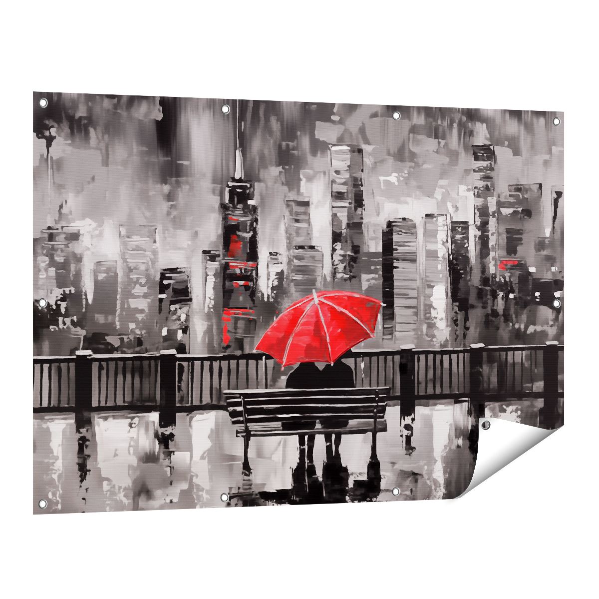 Tuinposter Paar Zittend op een Bankje met een Rode Paraplu